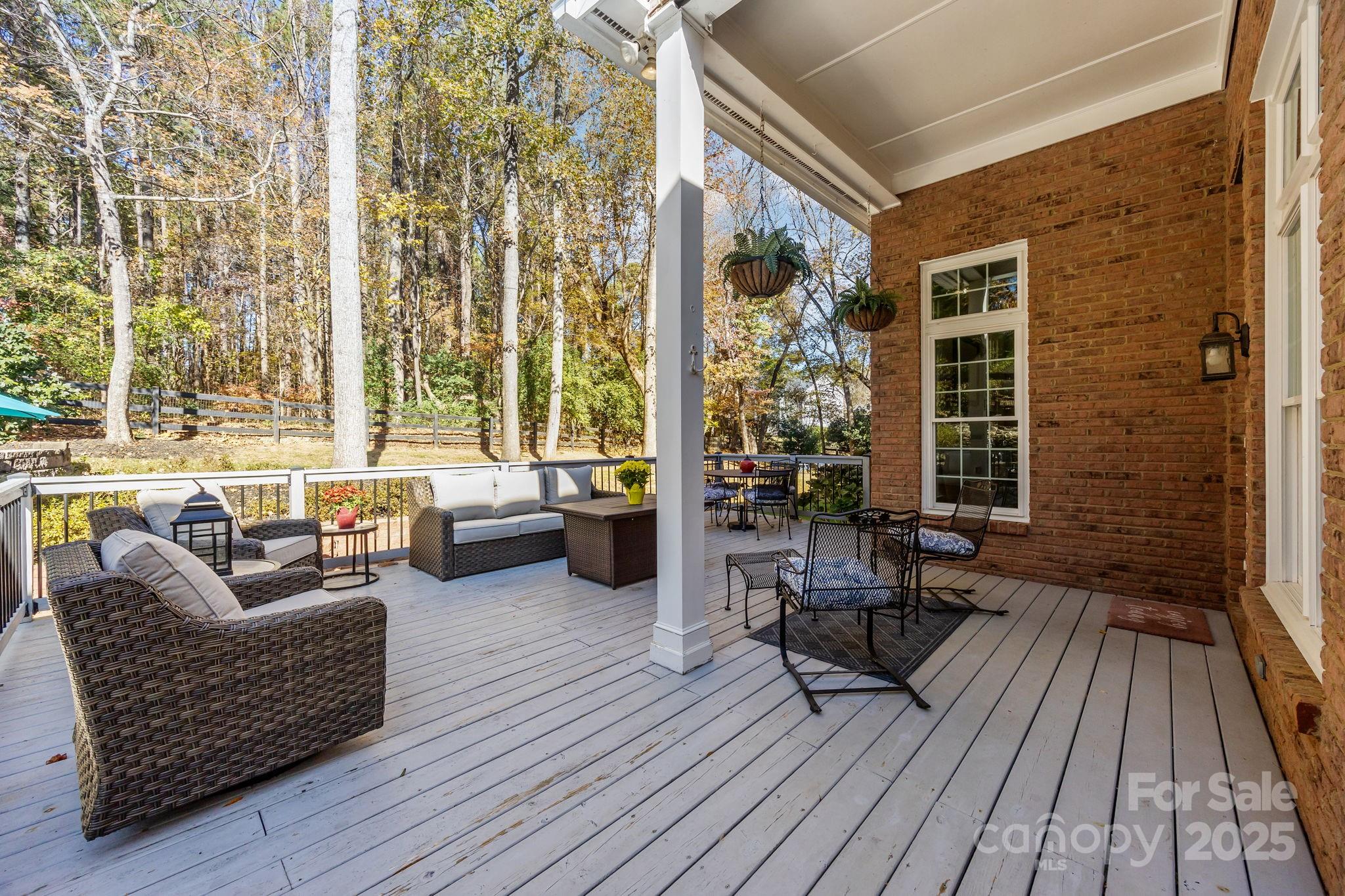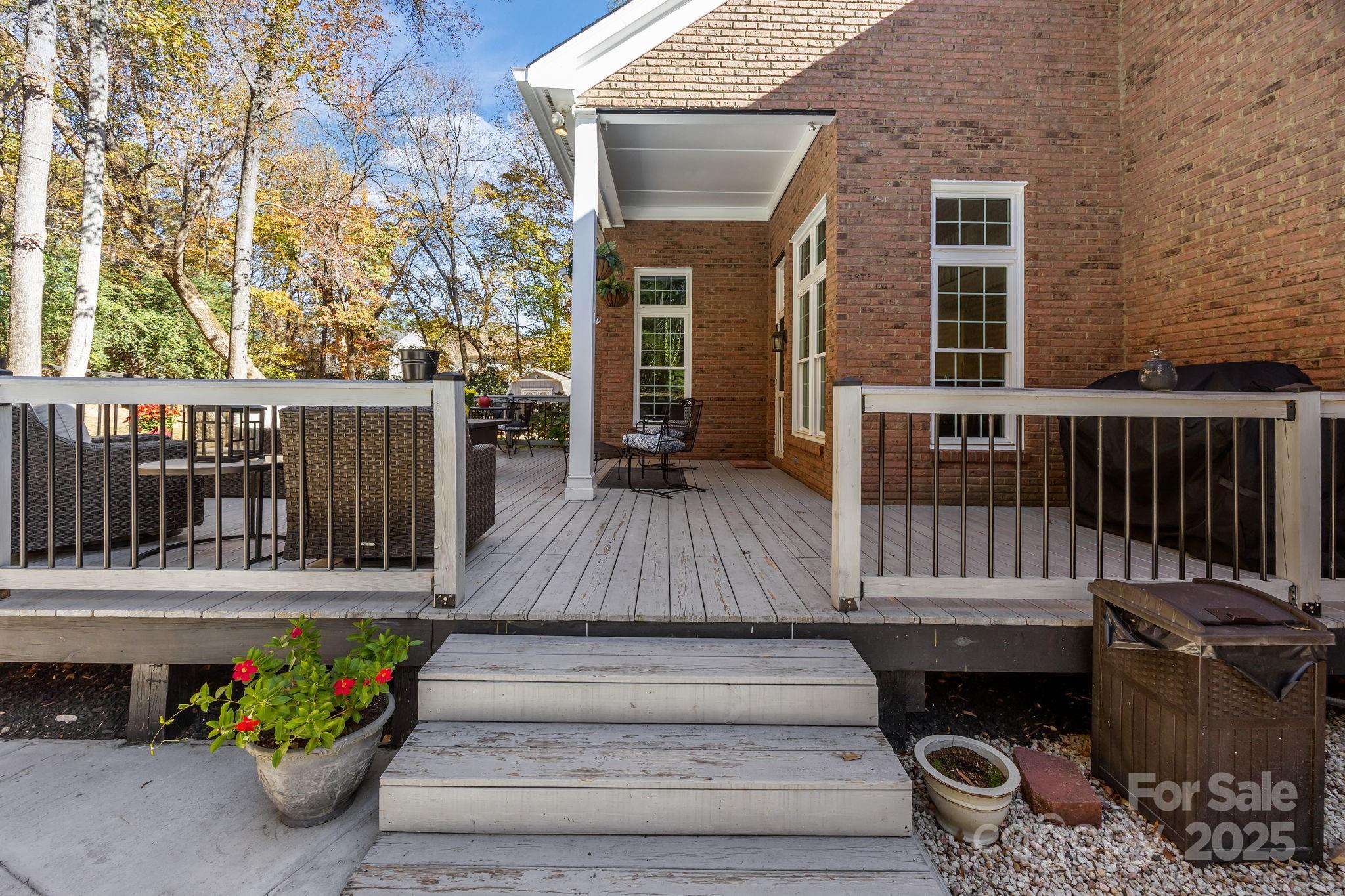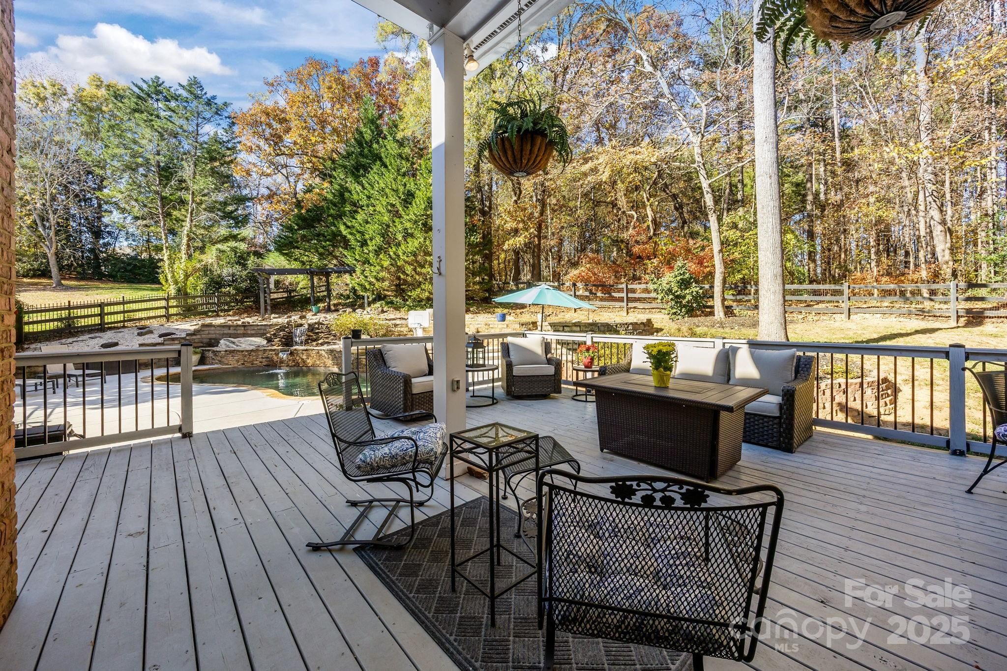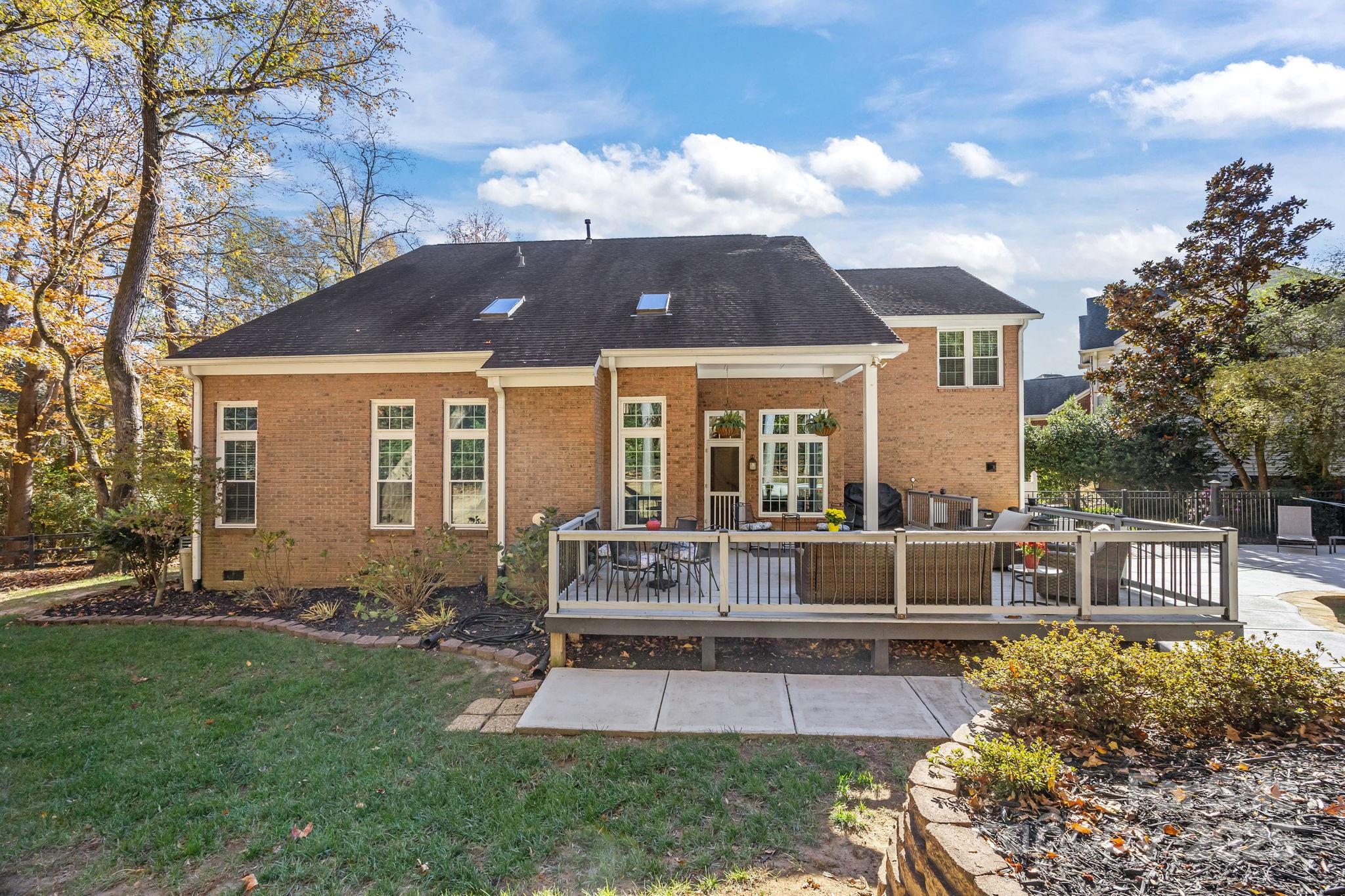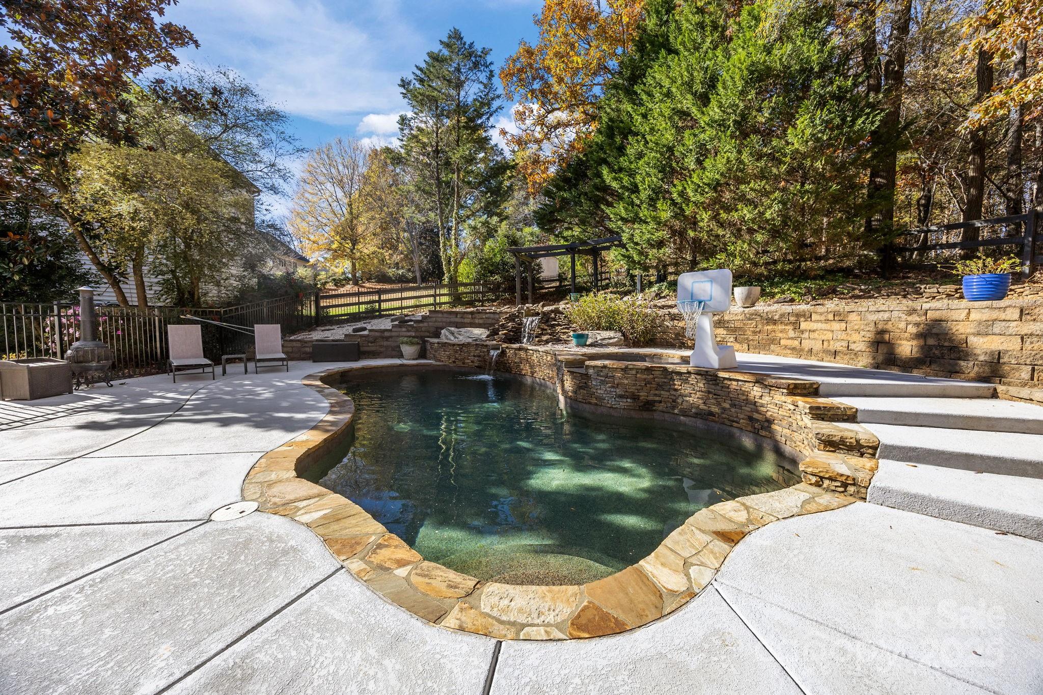 Stunning all-brick, five-bedroom home located on an oversized cul-de-sac lot in the highly desirable Ballantyne area. This prime location offers convenient access to shops, restaurants, and I-485. This spacious home features an open floor plan with elegant hardwood floors throughout the main living areas, including a dramatic two-story great room with abundant natural light from its skylights. The main-level primary ensuite offers a luxurious retreat with a jetted tub. A versatile fifth bedroom, which can also serve as a bonus room, boasts a large closet, flexible usage options, and a private staircase leading up from the main level. Outdoor living and entertaining are made easy with a beautiful pebble-tec in-ground pool and hot tub, complete with a soothing waterfall feature, alongside a spacious deck. The mature landscaping provides exceptional privacy and charm, enhancing this outdoor oasis. Additional highlights include a covered porch, an oversized garage with built-in shelving, a dedicated storage outbuilding, and a gas line ready for stove conversion. With a low HOA and exceptional curb appeal, the meticulously maintained yard and inviting exterior truly make this home a standout.