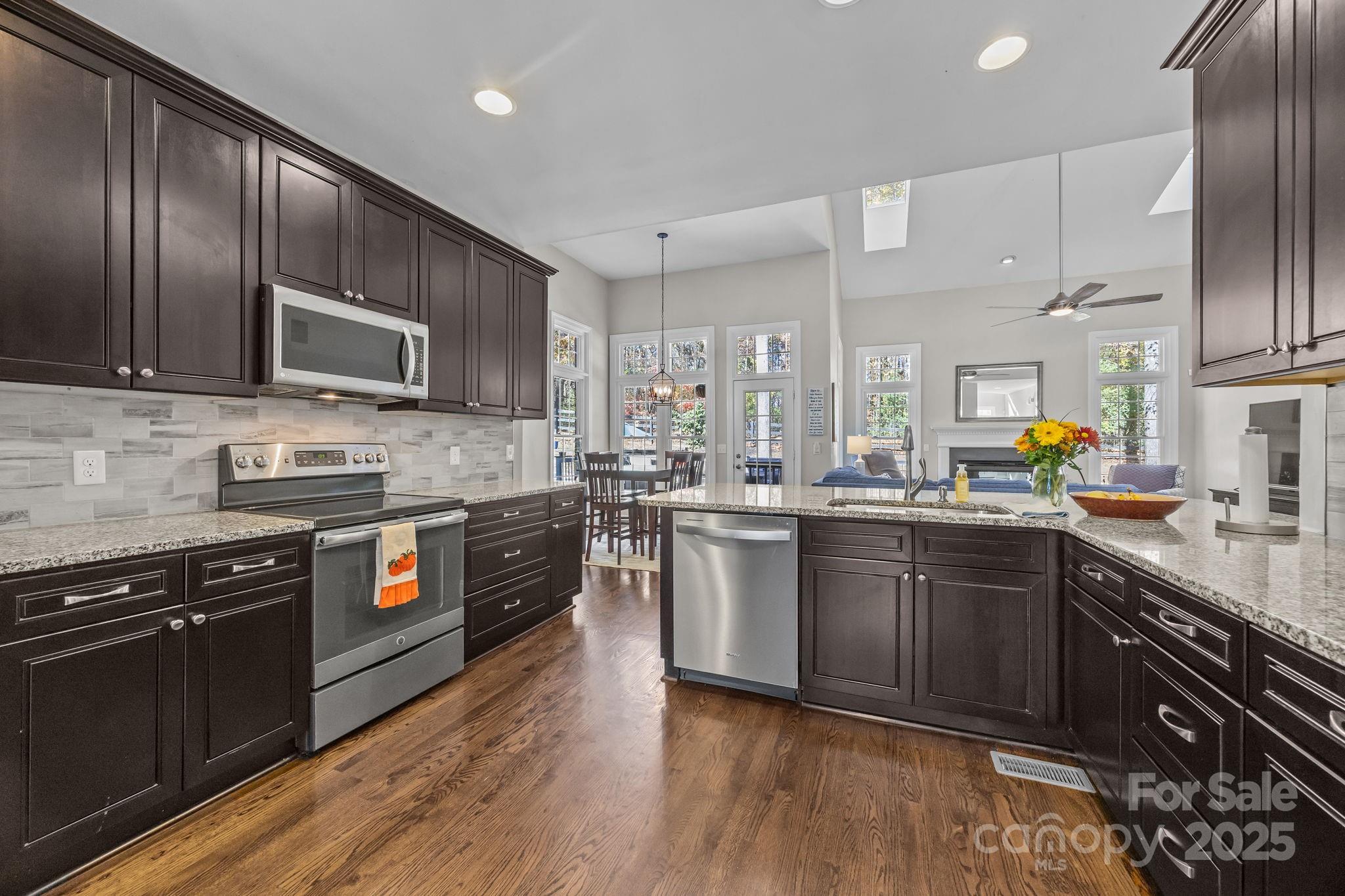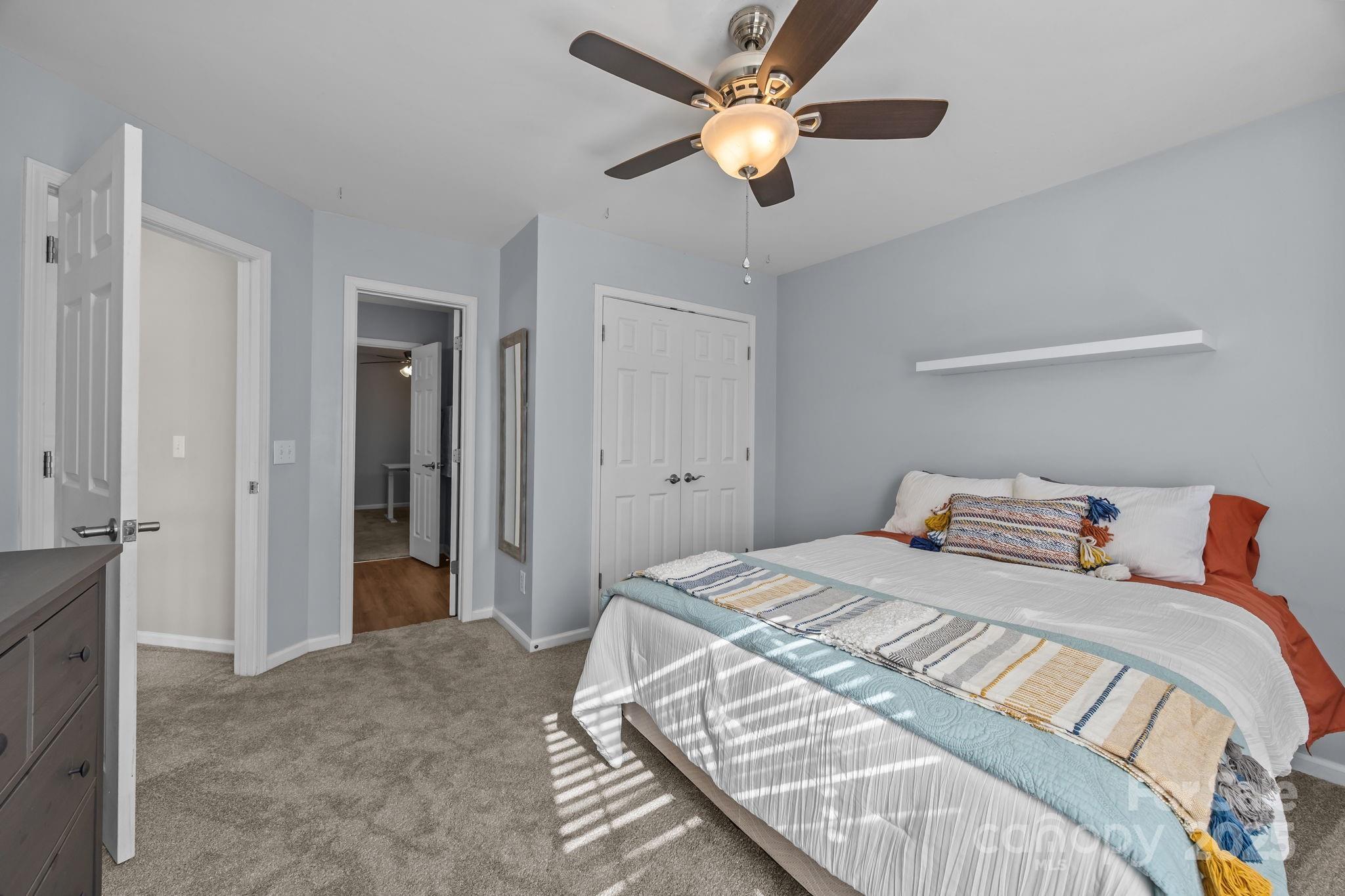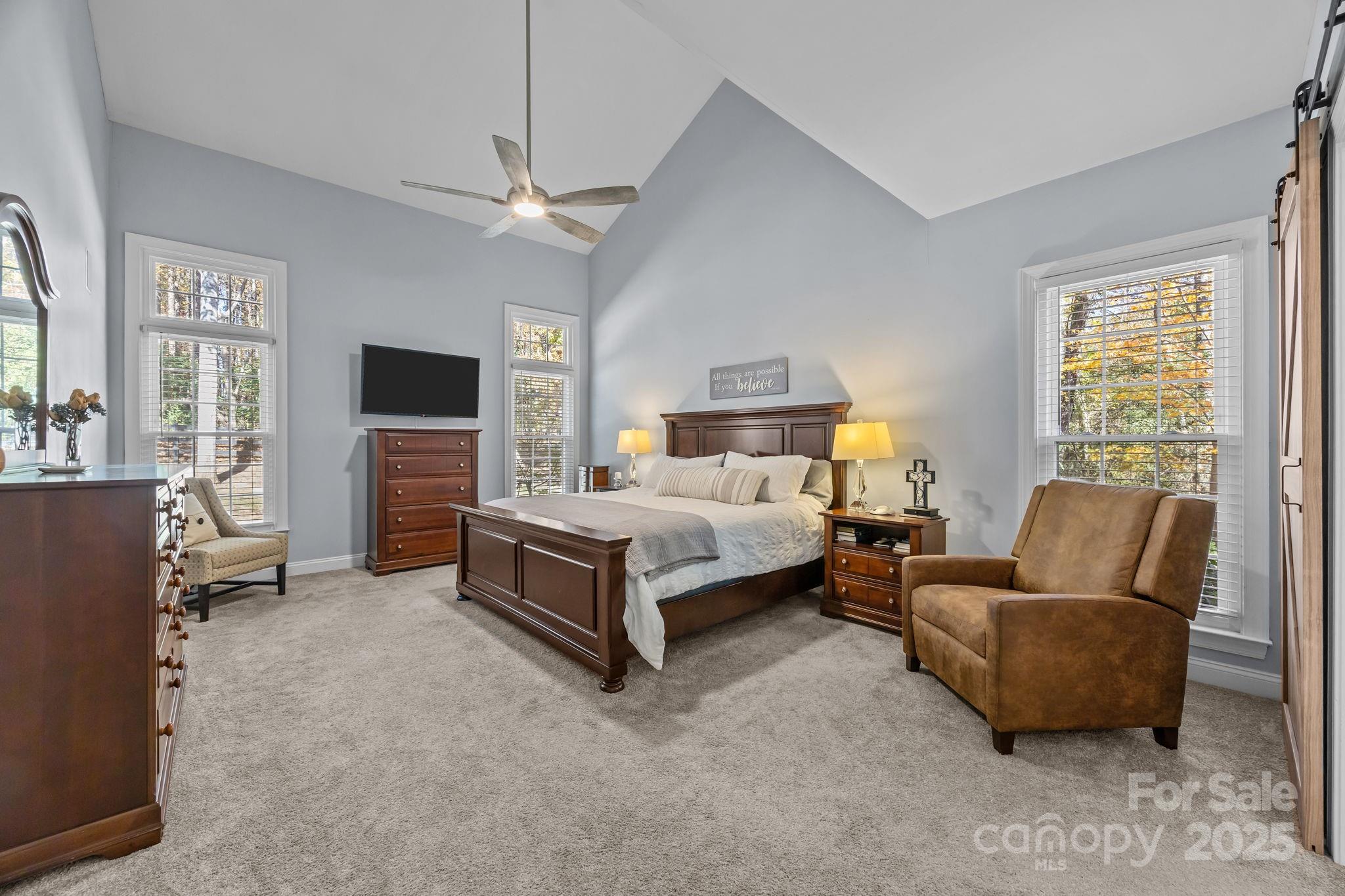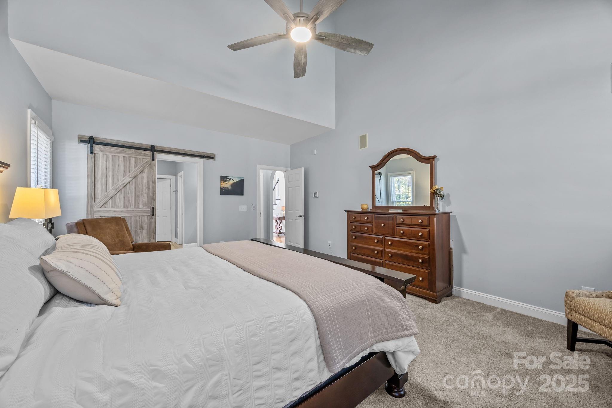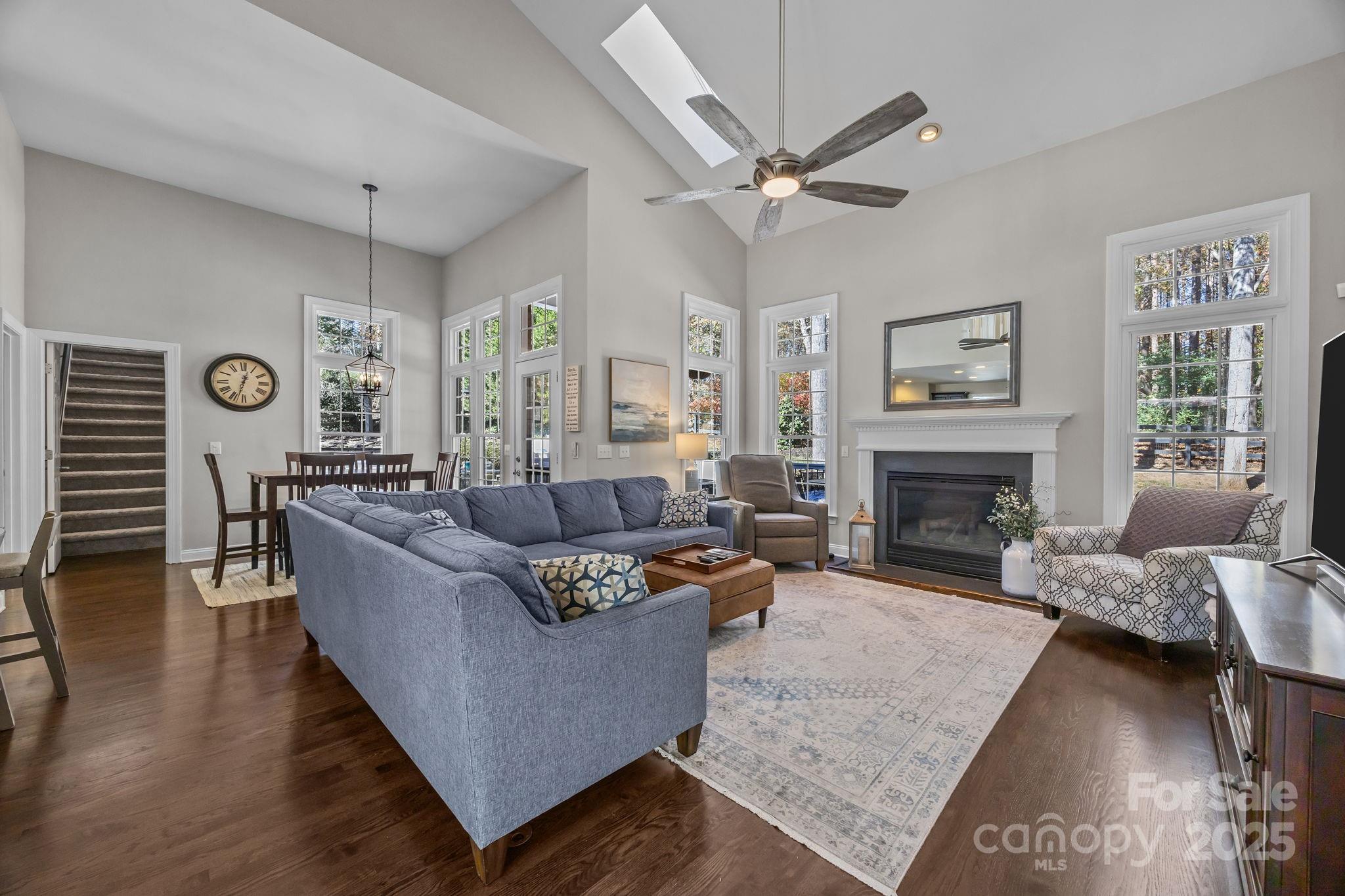 Stunning all-brick, five-bedroom home located on an oversized cul-de-sac lot in the highly desirable Ballantyne area. This prime location offers convenient access to shops, restaurants, and I-485. This spacious home features an open floor plan with elegant hardwood floors throughout the main living areas, including a dramatic two-story great room with abundant natural light from its skylights. The main-level primary ensuite offers a luxurious retreat with a jetted tub. A versatile fifth bedroom, which can also serve as a bonus room, boasts a large closet, flexible usage options, and a private staircase leading up from the main level. Outdoor living and entertaining are made easy with a beautiful pebble-tec in-ground pool and hot tub, complete with a soothing waterfall feature, alongside a spacious deck. The mature landscaping provides exceptional privacy and charm, enhancing this outdoor oasis. Additional highlights include a covered porch, an oversized garage with built-in shelving, a dedicated storage outbuilding, and a gas line ready for stove conversion. With a low HOA and exceptional curb appeal, the meticulously maintained yard and inviting exterior truly make this home a standout.