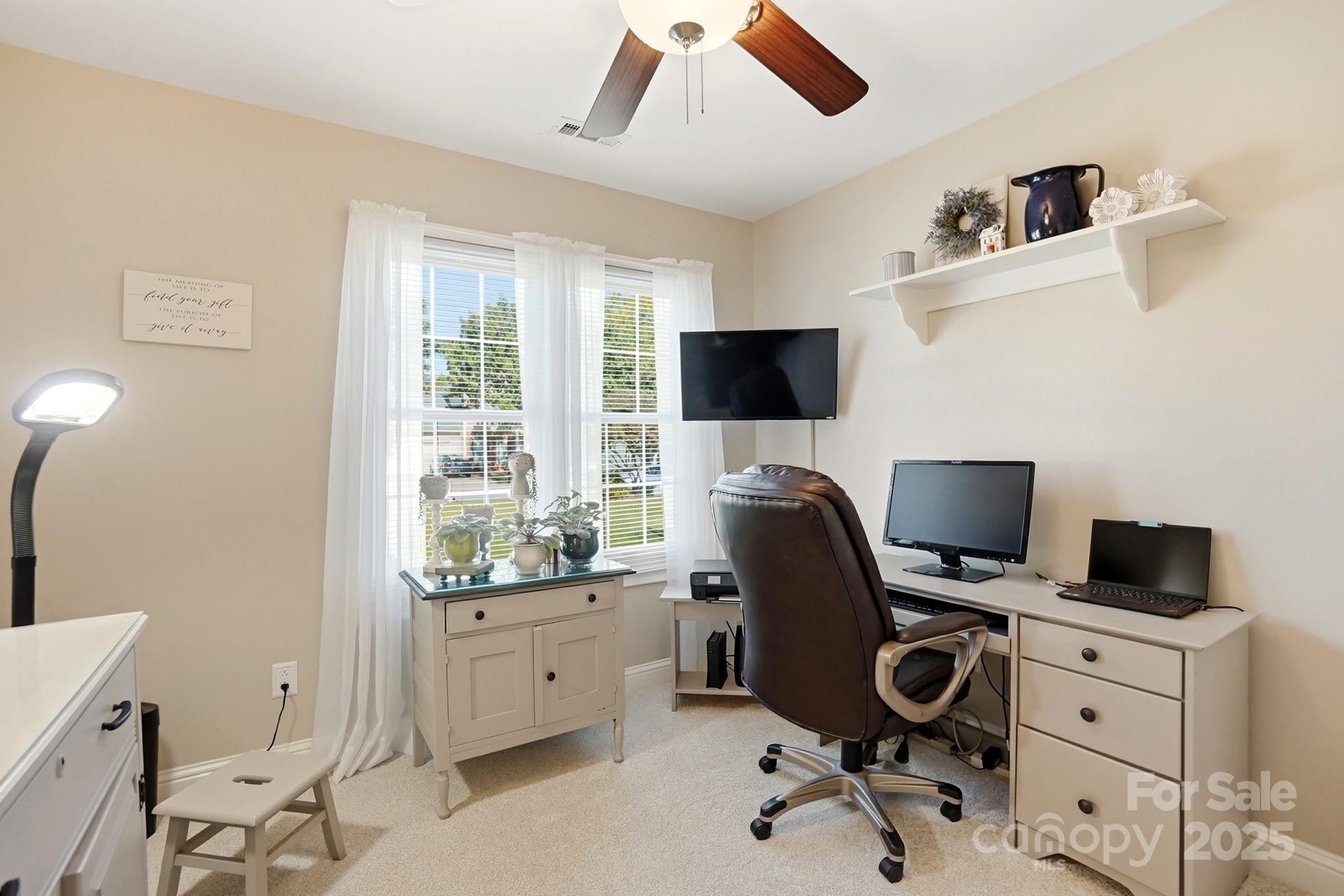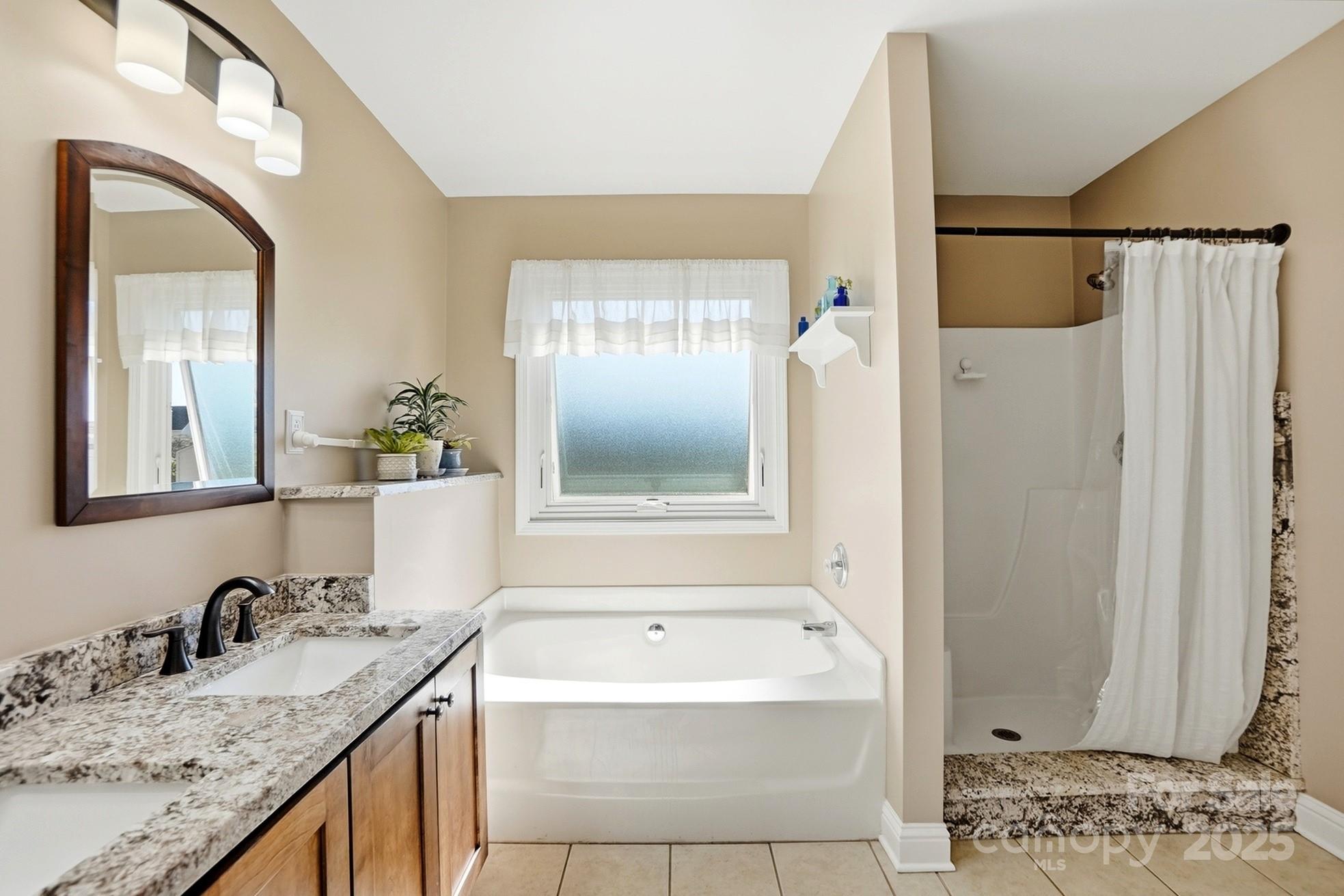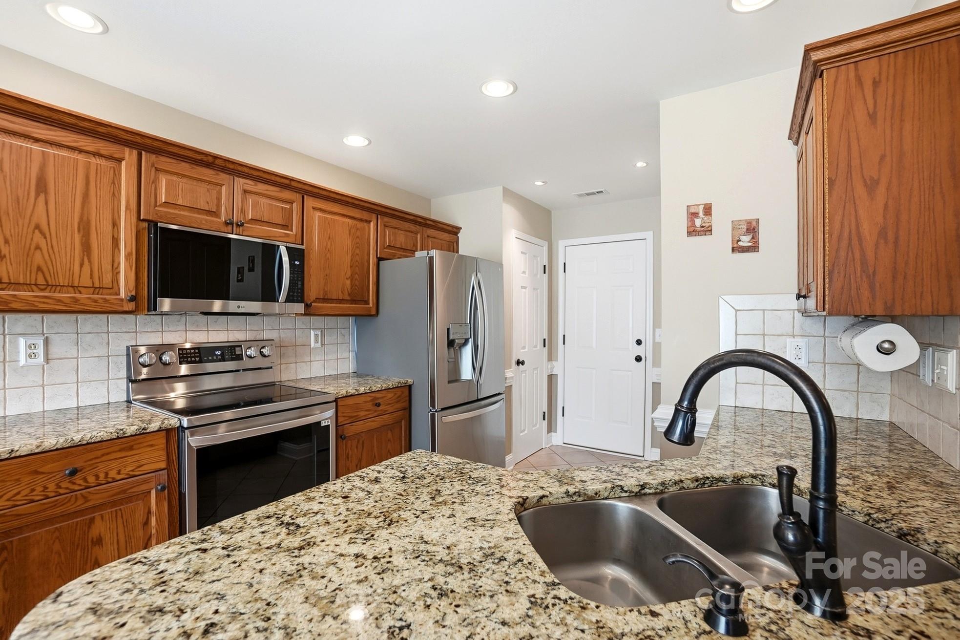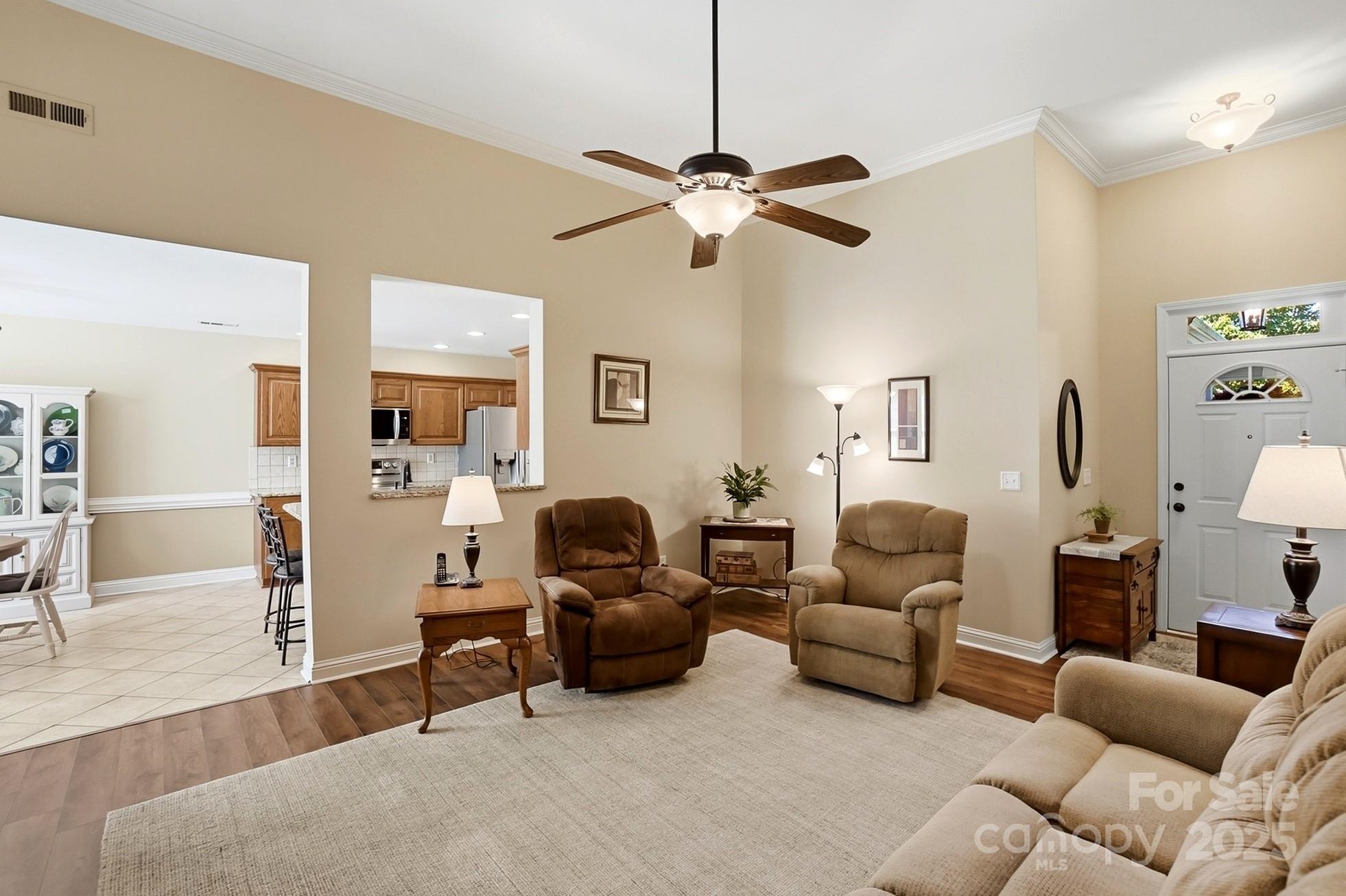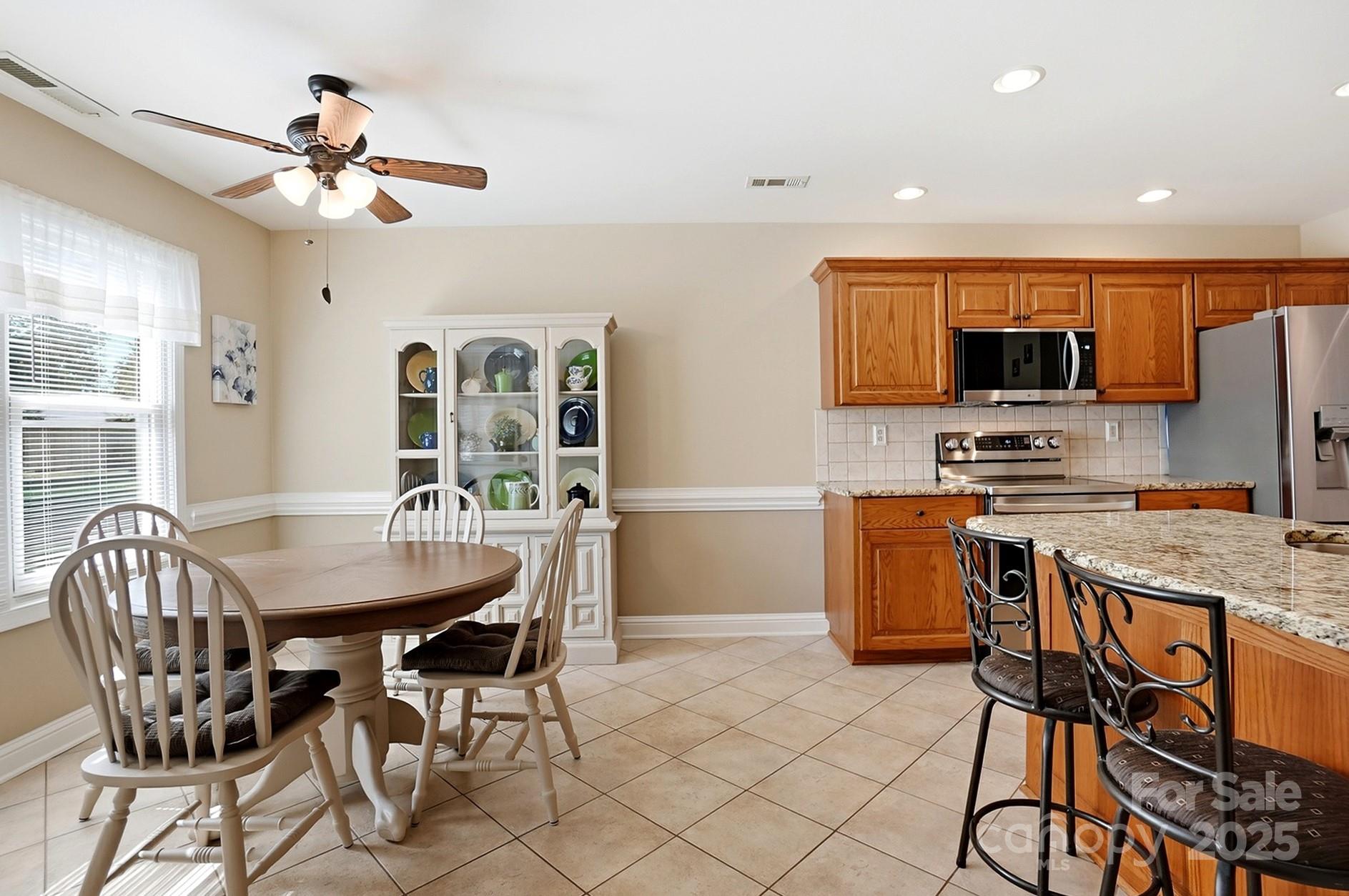 This charming 4-bedroom, 2-bath brick and vinyl home offers the perfect blend of style, comfort, and thoughtful updates. Featuring architectural shingles and a roof replaced in 2012, the exterior shines with curb appeal and a beautiful flat backyard complete with a brick patio in a herringbone design and a covered area by Charlotte Tent & Awning featuring extensive lighting and a ceiling fan — ideal for relaxing or entertaining. Inside, you’ll find an inviting great room with a gas fireplace, soaring ceilings, and crown molding that add to the home’s spacious feel. The kitchen is a true highlight with granite countertops, oak cabinetry, tile backsplash and flooring, and upgraded appliances including a smooth-top range, microwave, and dishwasher all less than a year old, plus a French door refrigerator (2022). A convenient laundry closet includes a stackable washer and dryer on pedestals. The primary suite features a tray ceiling, custom bathroom cabinetry with granite countertops, dual sinks, a walk-in shower, soaking tub, and large walk-in closet. The secondary bath also offers a custom cabinet with granite for a cohesive, upscale look. Additional updates include Anderson windows (2017) with a transferable warranty, HVAC system (2022) by Brothers Heating & Air, gas water heater (2021), and new Ridgeline Canyon LVP flooring (2024). Warm neutral colors throughout enhance the home’s inviting atmosphere. The property also offers a pull-down attic, insulated garage doors, a workbench area, and a 10x12 shed for extra storage. Move-in ready and beautifully maintained, this home combines timeless design with modern convenience in every detail.