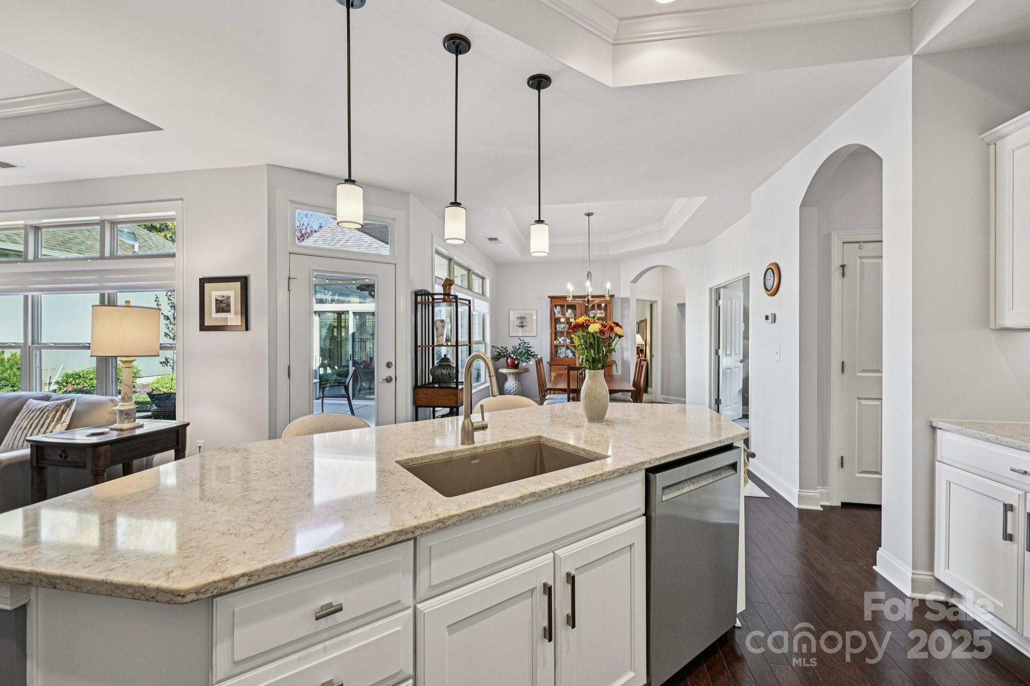 Discover effortless luxury in this beautifully upgraded ranch in The Courtyards of Marvin—one of the Waxhaw and Charlotte area’s premier 55+ communities. Bright and open, windows everywhere bringing the outside in! This home features an inviting living room with gas fireplace, dining area, hardwood floors, recessed lighting and custom shades. The modern kitchen shines with lovely white painted cabinetry with custom tile backsplash, quartz countertops, a large island, updated lighting, stainless steel apps, Bonus! fridge to remain! — perfect for everyday living or entertaining. A French-door den offers flexible space for work or relaxation. The serene primary suite impresses with a spacious bath featuring skylight, dual vanities and a zero-entry tile shower, plus generous walk-in closet. From the Primary suite, direct access to the lovely added Sunroom- what a treat to enjoy the outdoors protected and in privacy. Sizeable second bedroom and full bath provide ideal guest or hobby space. Outdoor living is effortless with a professionally coated anti-slip patio. Paver walk-ways and lush landscape complete the setting for enjoying during morning coffee or gatherings. Tons of storage available, interior storage closet garage storage. Best of all, move-in ready with all appliances incl. washer and dryer to remain! Recently painted exterior and fresh neutral interior paint. HOA-included lawn care means low-maintenance living at its finest. Enjoy the perfect blend of elegance, comfort, and convenience, premier location in close proximity to all the best area shopping and restaurants. Don't miss this exceptional Courtyards of Marvin home.