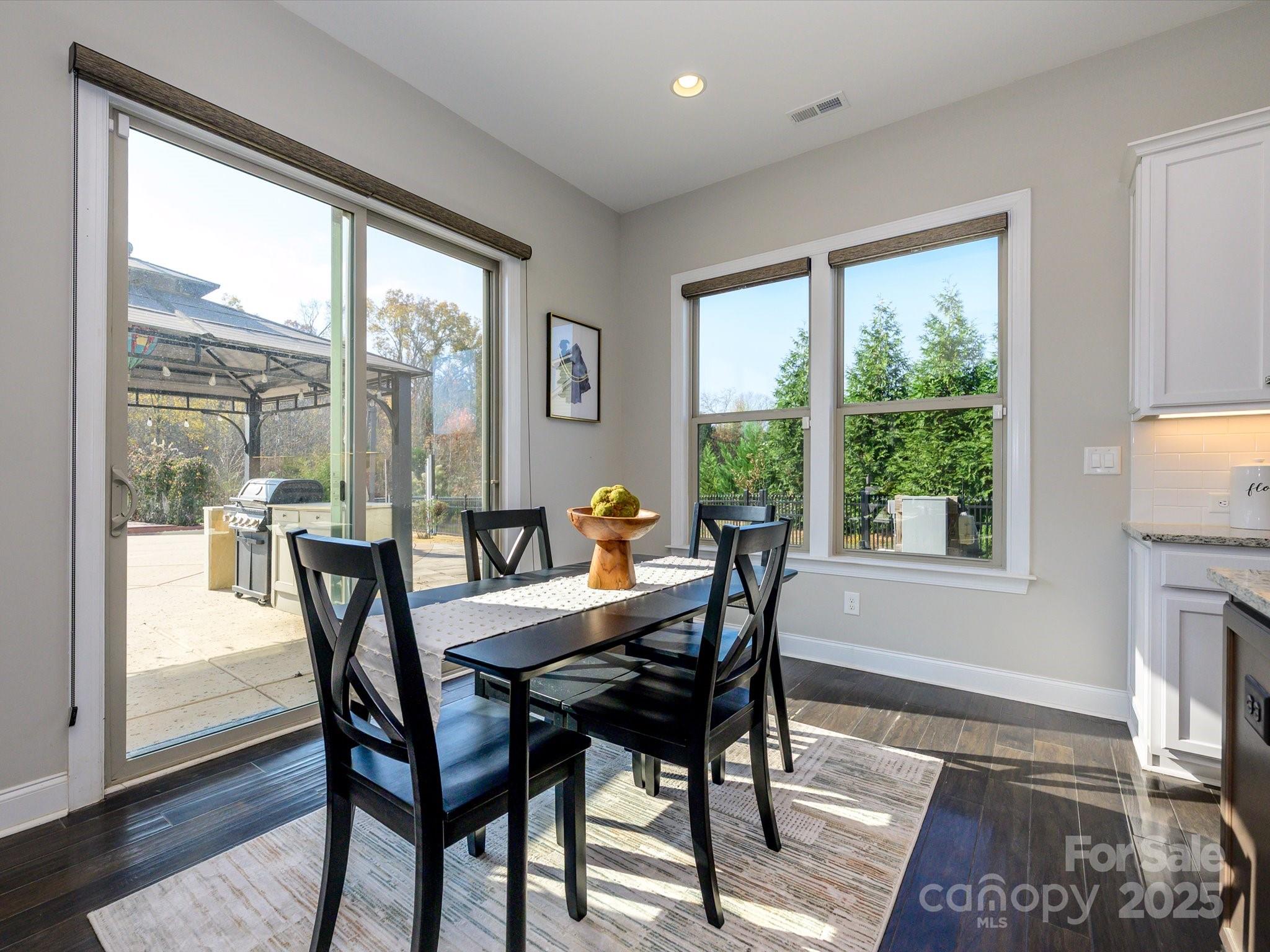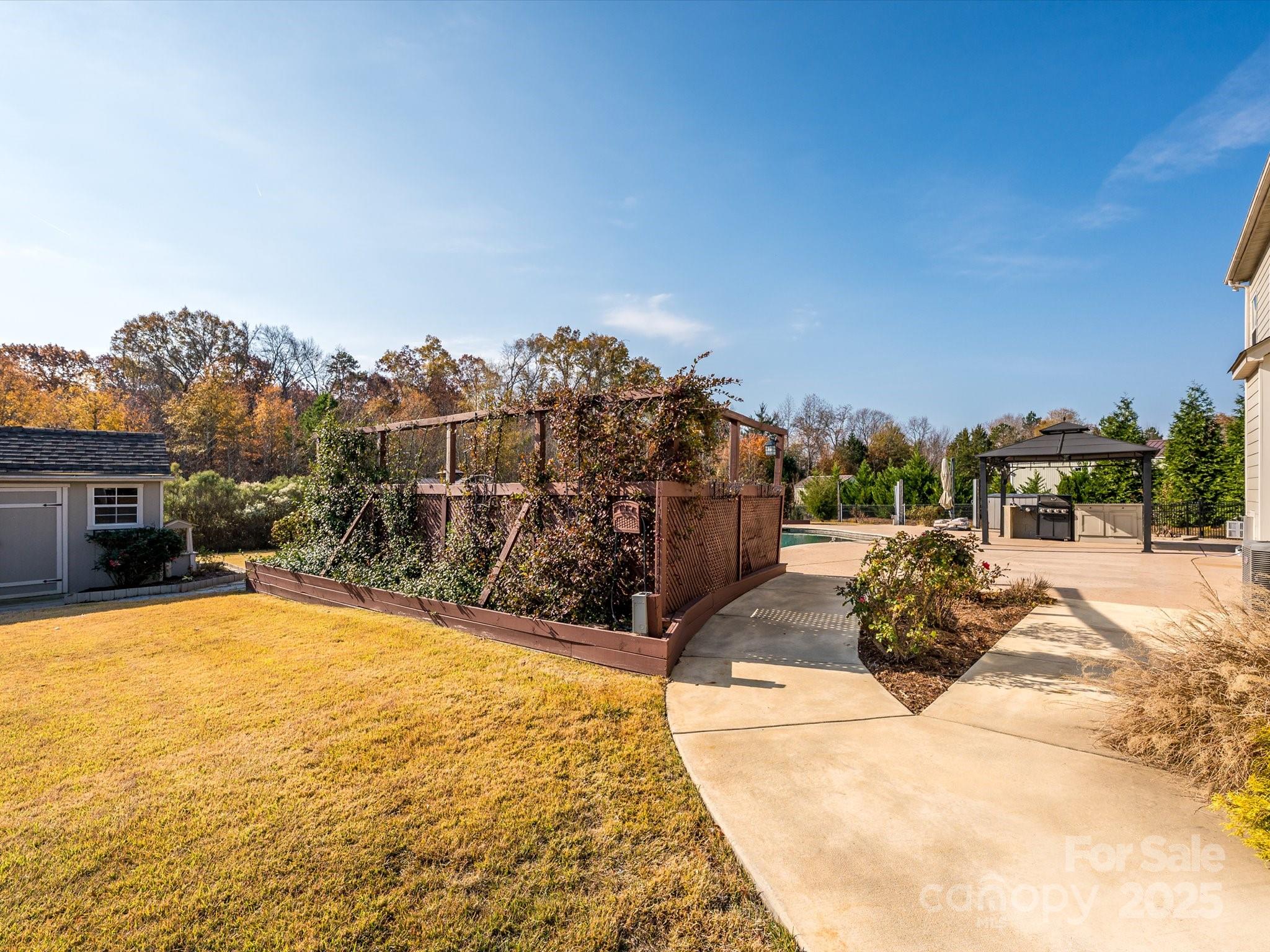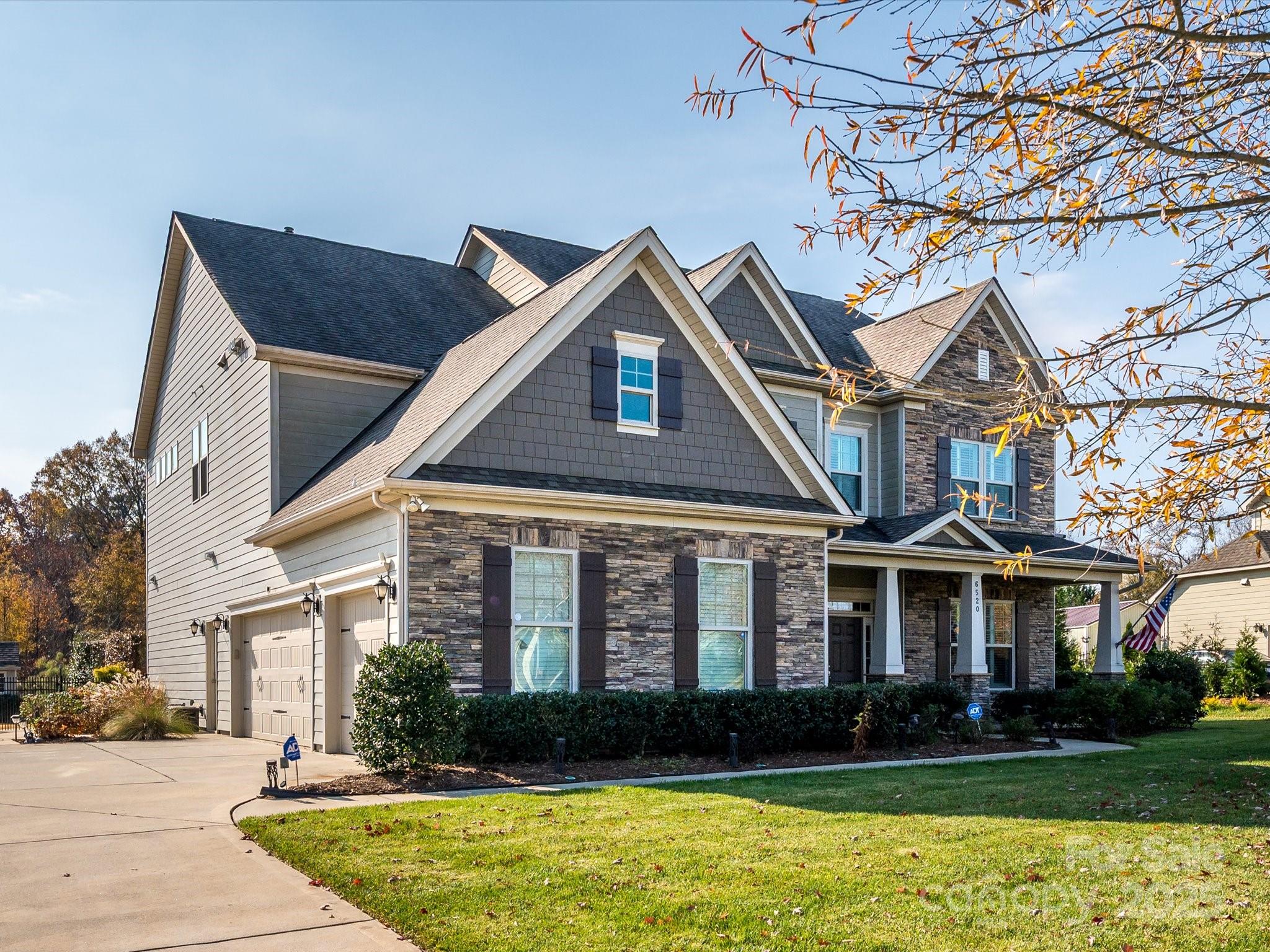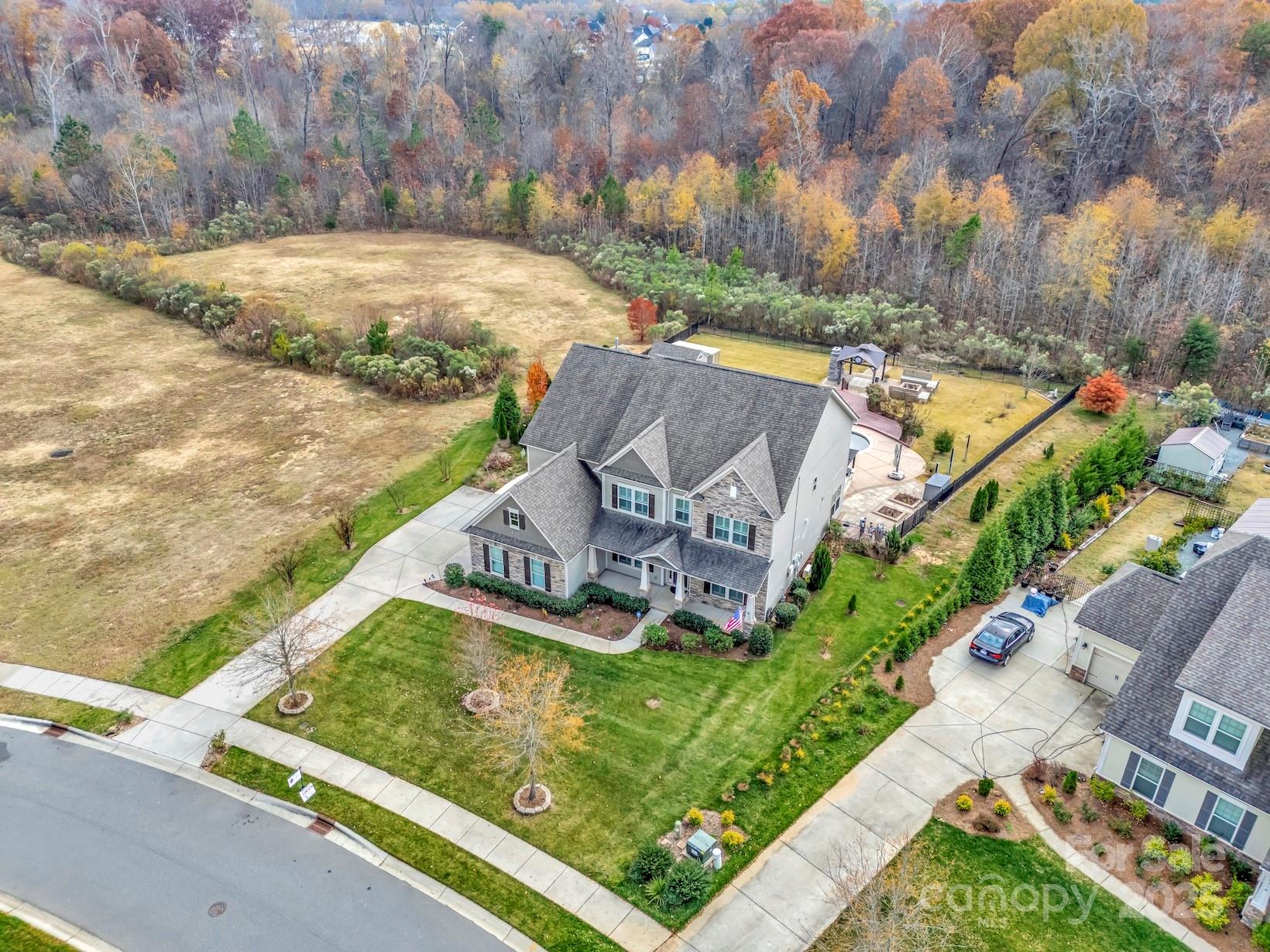 Welcome to this exceptional 2017 Bonterra-built home, where timeless elegance meets modern comfort. With striking Stackstone and cedar-style fiber cement accents, a covered front porch, and board-and-batten shutters, the exterior exudes curb appeal and invites you inside. A three-car side-load garage with pedestrian access, keypad entry, and ample hanging storage offers both convenience and style, complemented by a double-wide driveway and charming walkway to the front door with sidelights and transom. This home backs to trees and has no neighbor to the left. Step inside to discover gleaming hardwood floors throughout the main level, 10-foot ceilings, crown molding, and wainscoting, setting the tone for the sophisticated living spaces. To the left of the entry, a home office features French doors, plantation shutters, and ceiling fan with light kit—perfect for working from home. To the right, a formal dining room boasts tray ceilings, a stunning chandelier, and plantation shutters, ideal for entertaining. The great room is an inviting centerpiece with a coffered ceiling, gas-log fireplace with mantle, ceiling fan, and recessed lighting, seamlessly flowing into the gourmet kitchen. Here you’ll find 42-inch white cabinets with molding, granite countertops, subway tile backsplash, a large island, gas cooktop, wall oven and microwave, and dishwasher, along with a Butler’s pantry and spacious two-door pantry for all your culinary needs. A breakfast nook bathed in natural light completes this chef-ready space. The main floor guest suite provides privacy and comfort with a walk-in closet, en suite bath with walk-in shower, gentleman-height granite vanity, and tile flooring. A thoughtfully designed mudroom features a stainless steel utility sink, 18-inch tile, and built-in storage, conveniently located off the garage. Upstairs, wood treads with a carpet runner lead to a series of spacious bedrooms, including a Jack and Jill bath with dual sinks and tile surround. The bonus room with vaulted ceiling and ceiling fan overlooks the backyard, providing a versatile space for recreation or relaxation. The luxurious owner suite is a private retreat with vaulted ceilings, large windows, spa-inspired bath with garden tub, seamless glass walk-in shower, dual vanities, water closet, and an expansive walk-in closet with organizers. The backyard is a serene oasis designed for entertainment and relaxation, featuring a saline pool with PebbleTec finish, hot tub (sold as-is with no known issues), patio with a pergola and built-in grilling area, deck with seating areas, outdoor fireplace, built-in fire pit, pavilion, greenhouse, raised garden beds, and outbuilding. With solar energy, this home combines eco-friendly efficiency with upscale living. No pets have lived in this home and has been a non-smoking household.