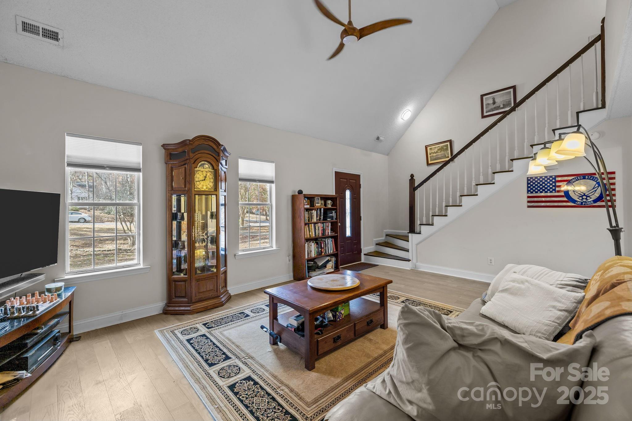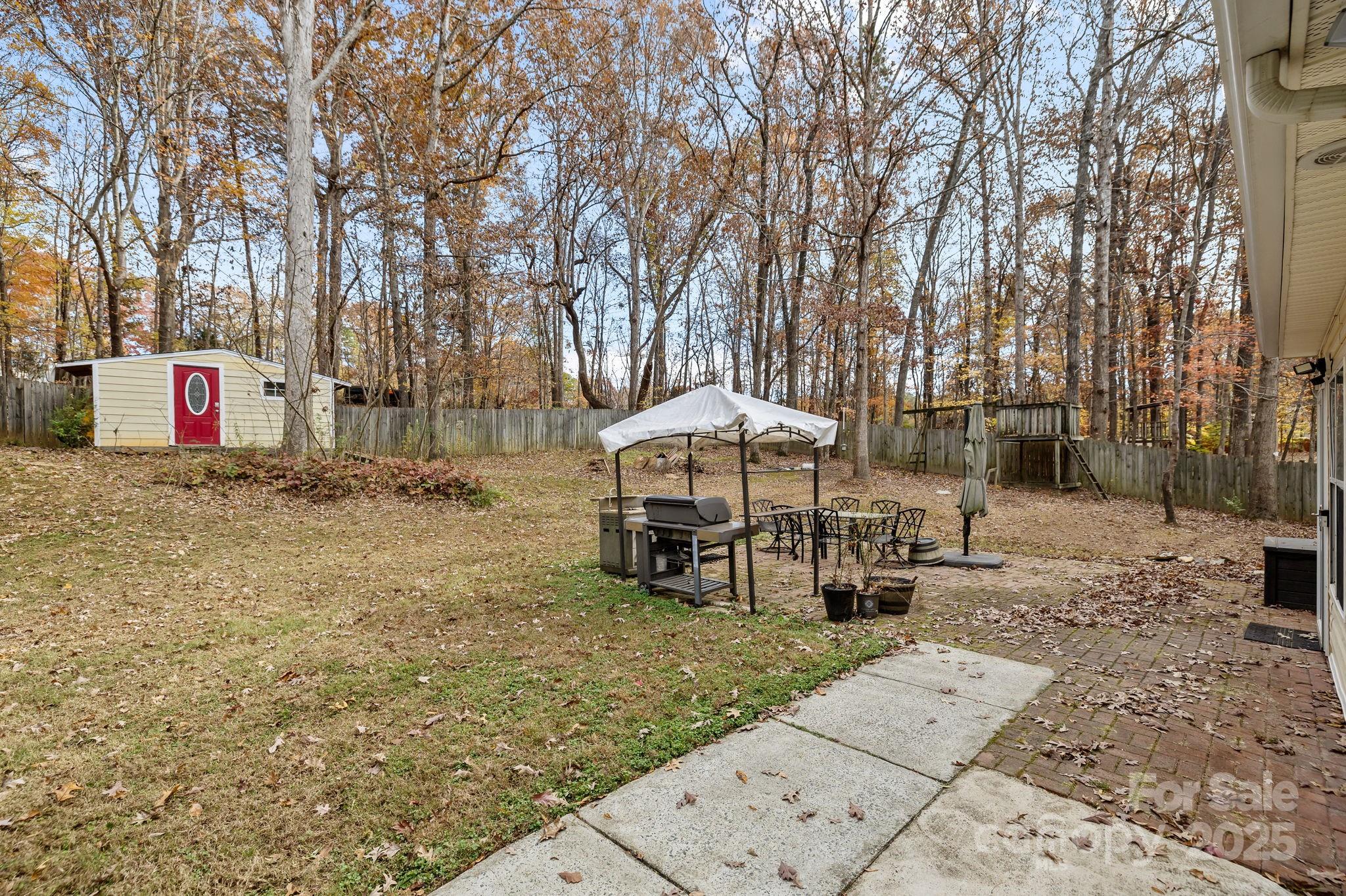 Tucked back into a private, wooded setting with no HOA, this Waxhaw home offers updated comfortable living, a flexible layout, and the kind of natural light and privacy buyers consistently ask for. The two-story great room makes an immediate impact with its vaulted ceilings, wood-burning fireplace, and easy flow into the dining area and kitchen. The kitchen has been refreshed with painted cabinetry, granite countertops, newer appliances (2024 Microwave, Refrigerator and Stove), modern lighting, and good prep space. A window over the sink overlooks the backyard, and the adjoining dining area offers direct access to the patio for weekend grilling or everyday convenience. The main-level primary suite features a vaulted ceiling, generous wall space for furniture placement, and large windows for soft natural light. The en-suite bath includes a double-sink vanity with plenty of cabinet space below, plus updated lighting, and a walk-in tiled shower with a rainfall head and built-in shelving. Upstairs, two additional bedrooms share a well-maintained full bath (with Jacuzzi air tub - tiny bubbles), and there’s an open landing that works well as an office, reading space, or hobby nook. All bedrooms have ample closet space and nice light throughout the day. Outside, the fenced backyard provides both privacy and usability. There’s a paver patio for outdoor dining, space for pets or play, mature trees, and a large storage building with easy access. The oversized carport offers shaded parking plus room for tools and projects. Additional updates include engineered wood flooring on the main level, fresh paint, updated fixtures, vinyl siding, 30-year architectural shingles, and well-kept major systems. With Union County taxes, convenience to both the Cureton Shopping Center and the Lowe’s/Walmart-anchored center, restaurants, medical offices, and historic downtown Waxhaw, the location offers easy access to everything you need. Central HVAC and Heat replaced in 2019; Roof 2017; Water Heater 2024. Tucked inside a peaceful neighborhood - this is a great value in today’s market.