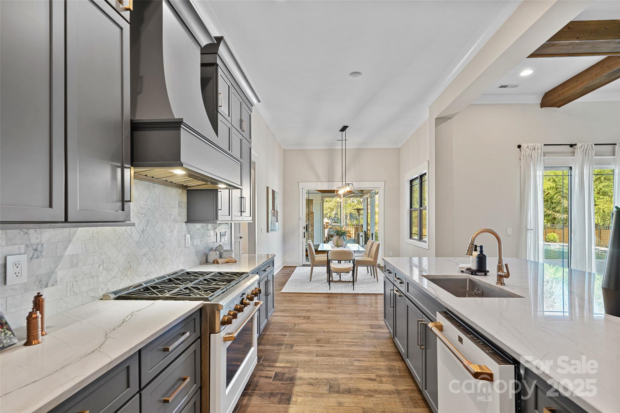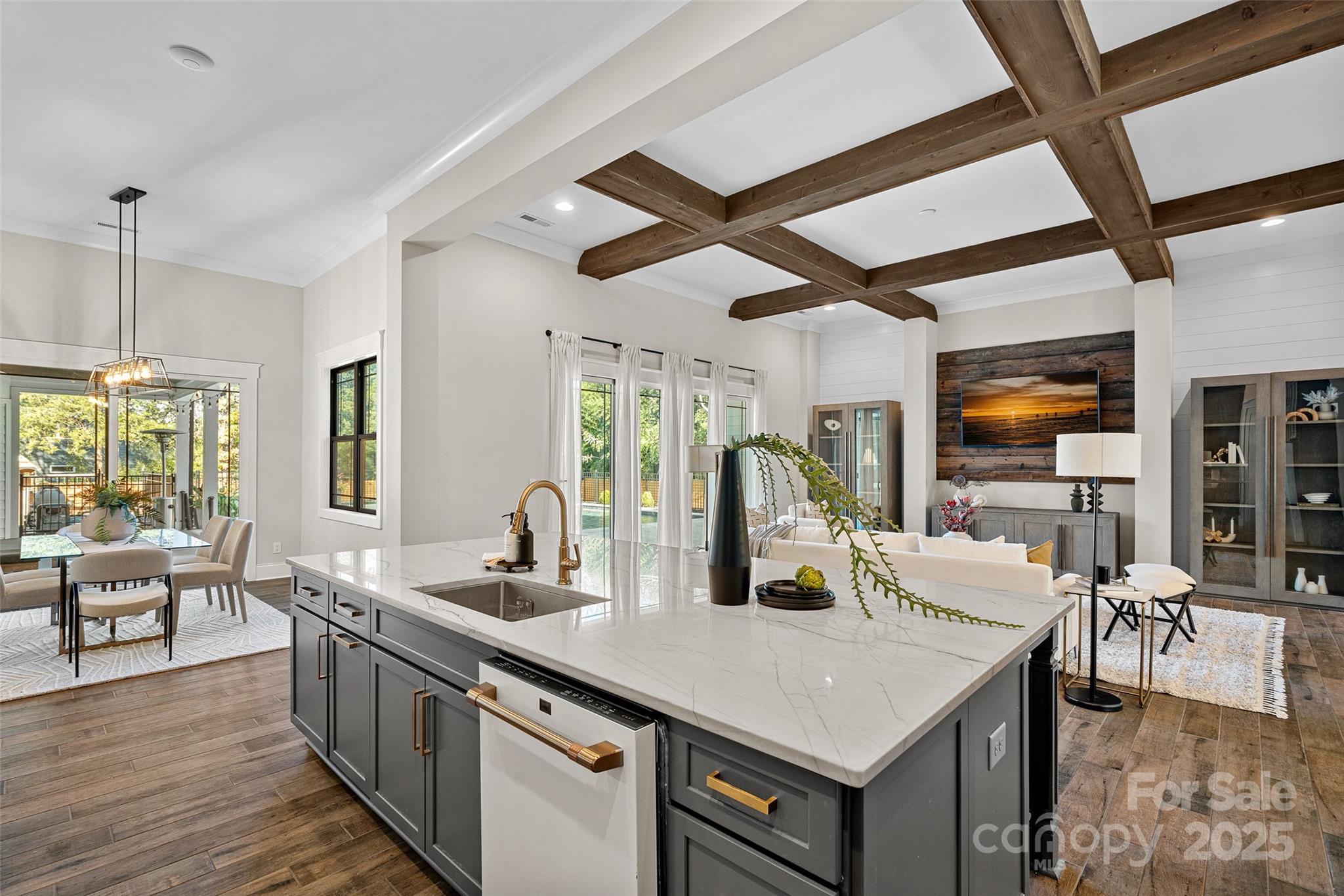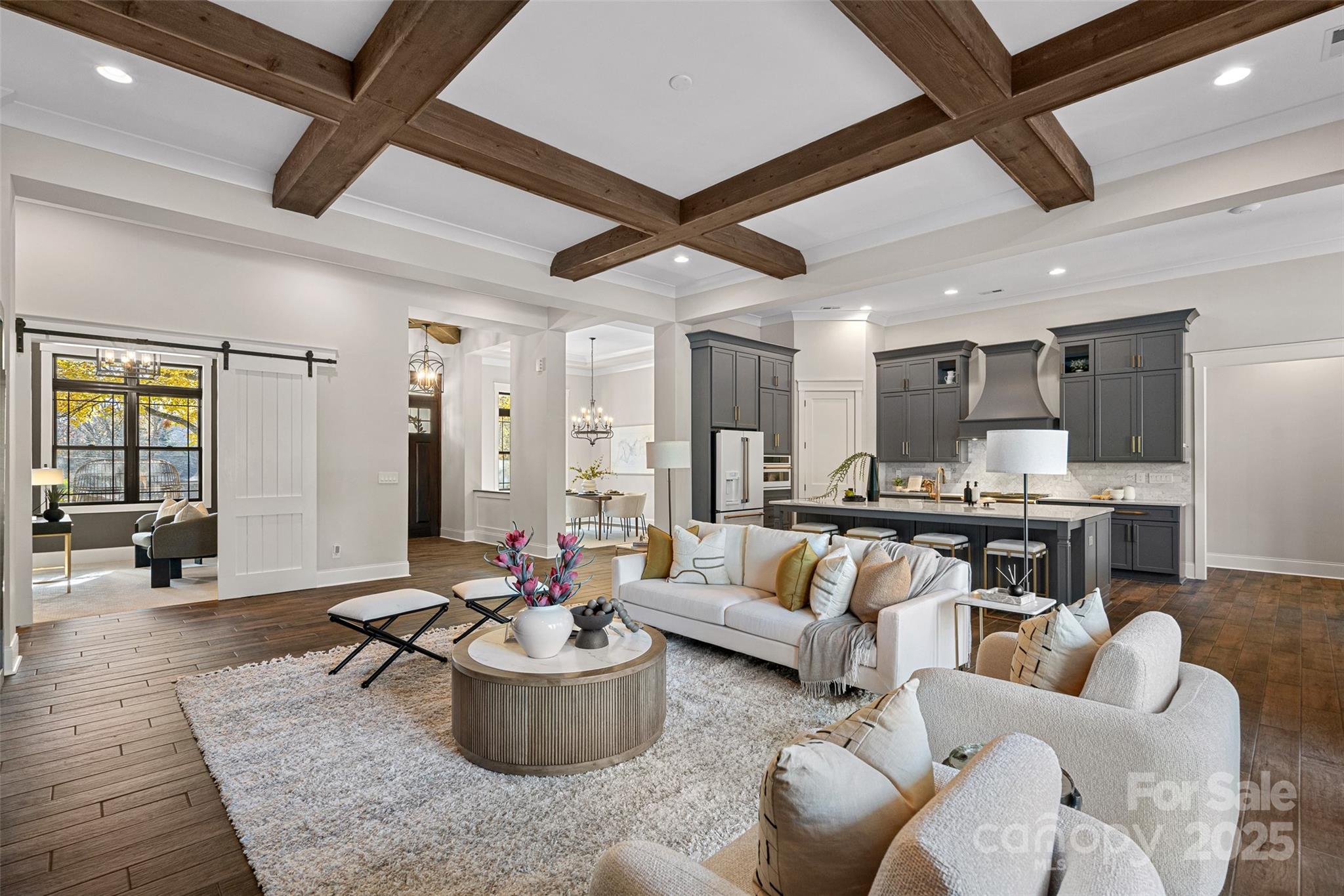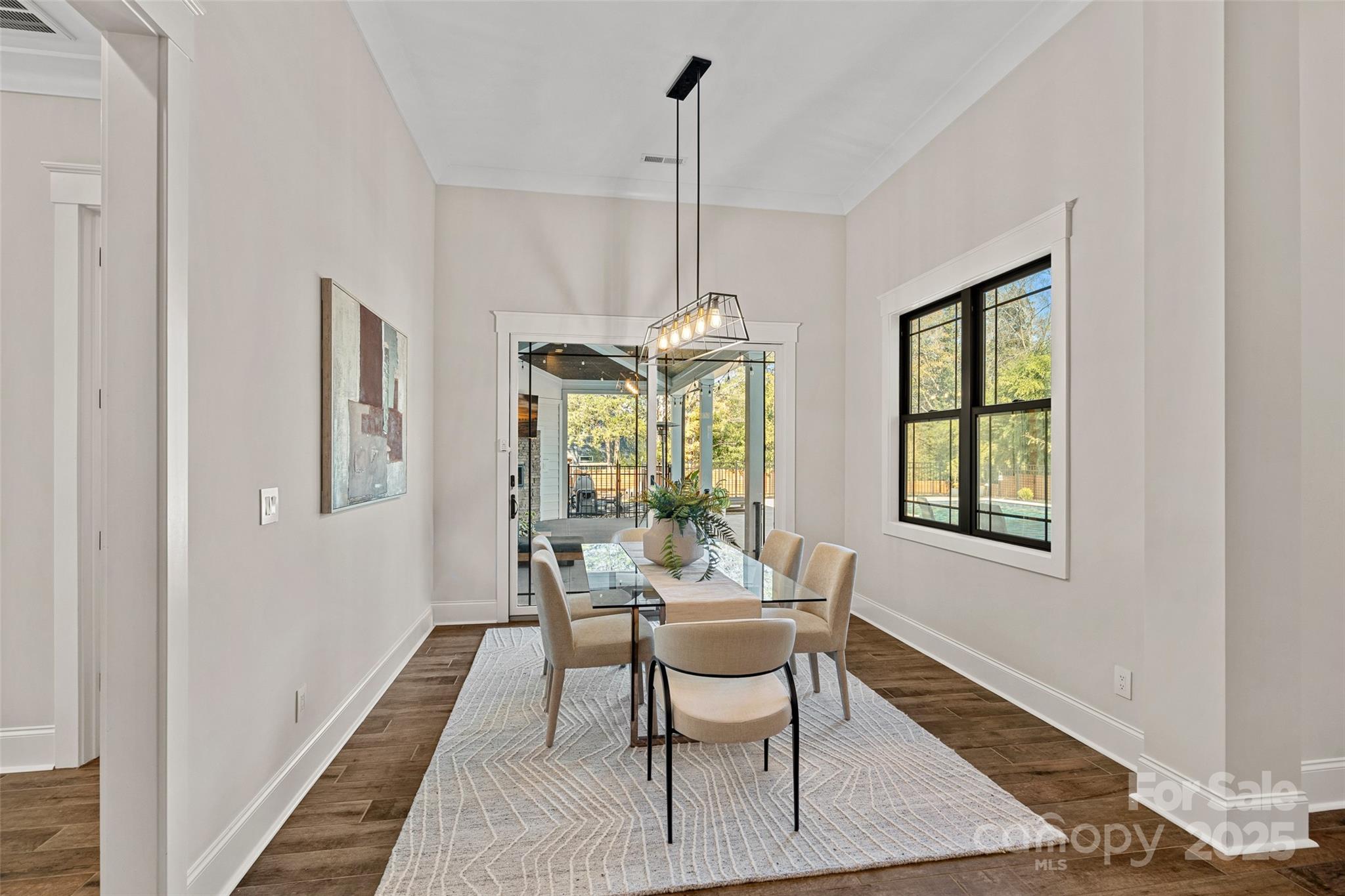 This meticulously crafted custom modern ranch blends elevated design, thoughtful one level living, and resort style outdoor amenities with impeccable craftsmanship and details throughout. Situated on over an acre of private, fenced grounds, the home offers exceptional attention to detail and a layout crafted for both comfort and entertaining. A welcoming covered front porch leads into a light filled interior highlighted by tall ceilings, exposed wood beams, and impressive trim work. The split bedroom layout provides privacy, while an executive office offers a quiet space for work or study. The primary owners retreat features oversized his and her closets and a spa inspired bath with soaking tub, tiled shower, and Restoration Hardware double vanity. Each ample sized secondary bedroom includes its own private ensuite bath. The gourmet chef’s kitchen showcases a large center island, 6 burner gas range, Café Collection appliances, and beautiful cabinetry, all opening to a spacious living area and sunny breakfast room. French sliders extend the living space to a covered patio with outdoor fireplace overlooking the modern heated pool and spa. A dedicated cabana bath provides convenient access from the pool terrace. The finished room above the oversized two car garage is ideal for a gym, flex space, or bonus room. The expansive fenced backyard offers generous room to enjoy the outdoors, with space for entertaining and recreation, pets, or gardening alongside the pool. With privacy, luxury finishes, direct access to the greenway, and close proximity to Davidson, Cornelius, and Northcross conveniences, this home delivers refined living in a premier quiet setting.