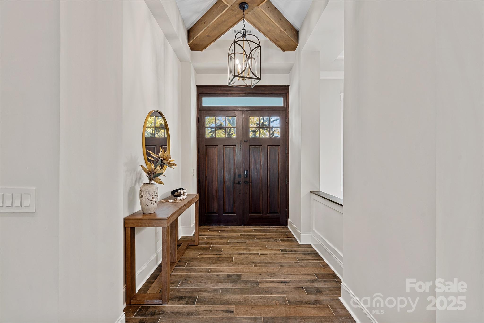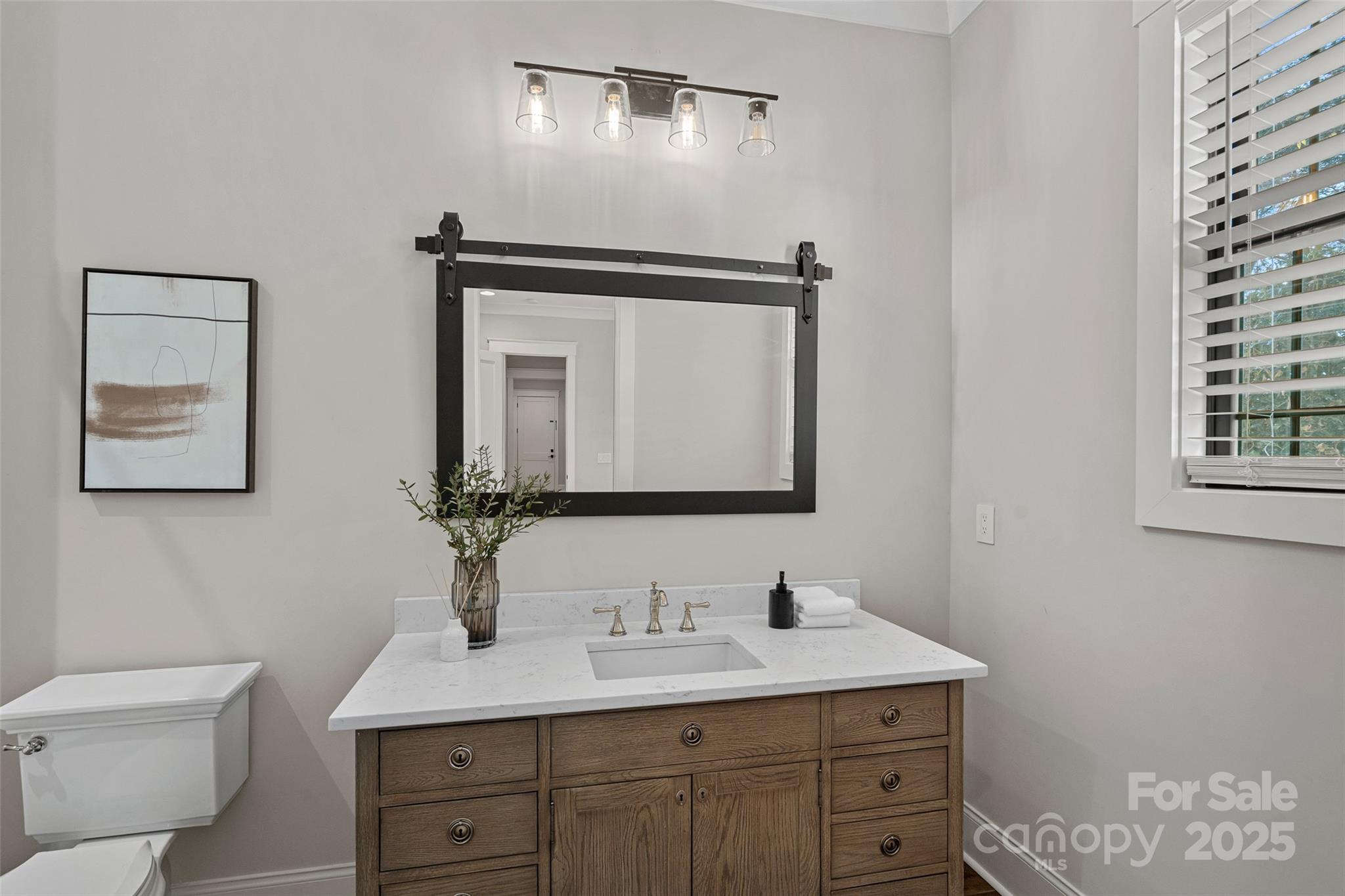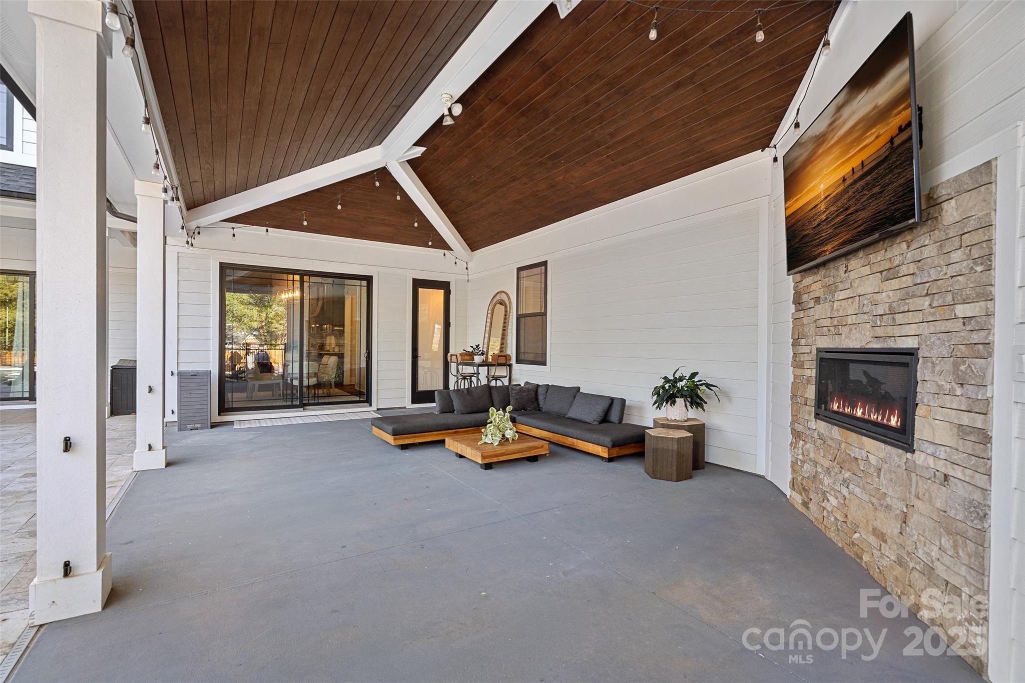 This meticulously crafted custom modern ranch blends elevated design, thoughtful one level living, and resort style outdoor amenities with impeccable craftsmanship and details throughout. Situated on over an acre of private, fenced grounds, the home offers exceptional attention to detail and a layout crafted for both comfort and entertaining. A welcoming covered front porch leads into a light filled interior highlighted by tall ceilings, exposed wood beams, and impressive trim work. The split bedroom layout provides privacy, while an executive office offers a quiet space for work or study. The primary owners retreat features oversized his and her closets and a spa inspired bath with soaking tub, tiled shower, and Restoration Hardware double vanity. Each ample sized secondary bedroom includes its own private ensuite bath. The gourmet chef’s kitchen showcases a large center island, 6 burner gas range, Café Collection appliances, and beautiful cabinetry, all opening to a spacious living area and sunny breakfast room. French sliders extend the living space to a covered patio with outdoor fireplace overlooking the modern heated pool and spa. A dedicated cabana bath provides convenient access from the pool terrace. The finished room above the oversized two car garage is ideal for a gym, flex space, or bonus room. The expansive fenced backyard offers generous room to enjoy the outdoors, with space for entertaining and recreation, pets, or gardening alongside the pool. With privacy, luxury finishes, direct access to the greenway, and close proximity to Davidson, Cornelius, and Northcross conveniences, this home delivers refined living in a premier quiet setting.