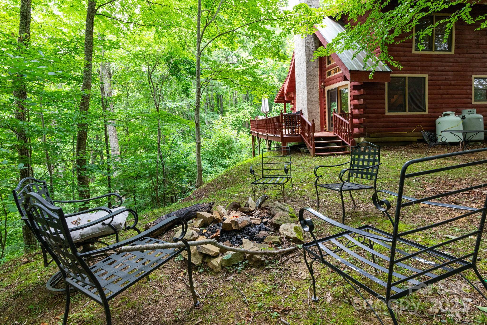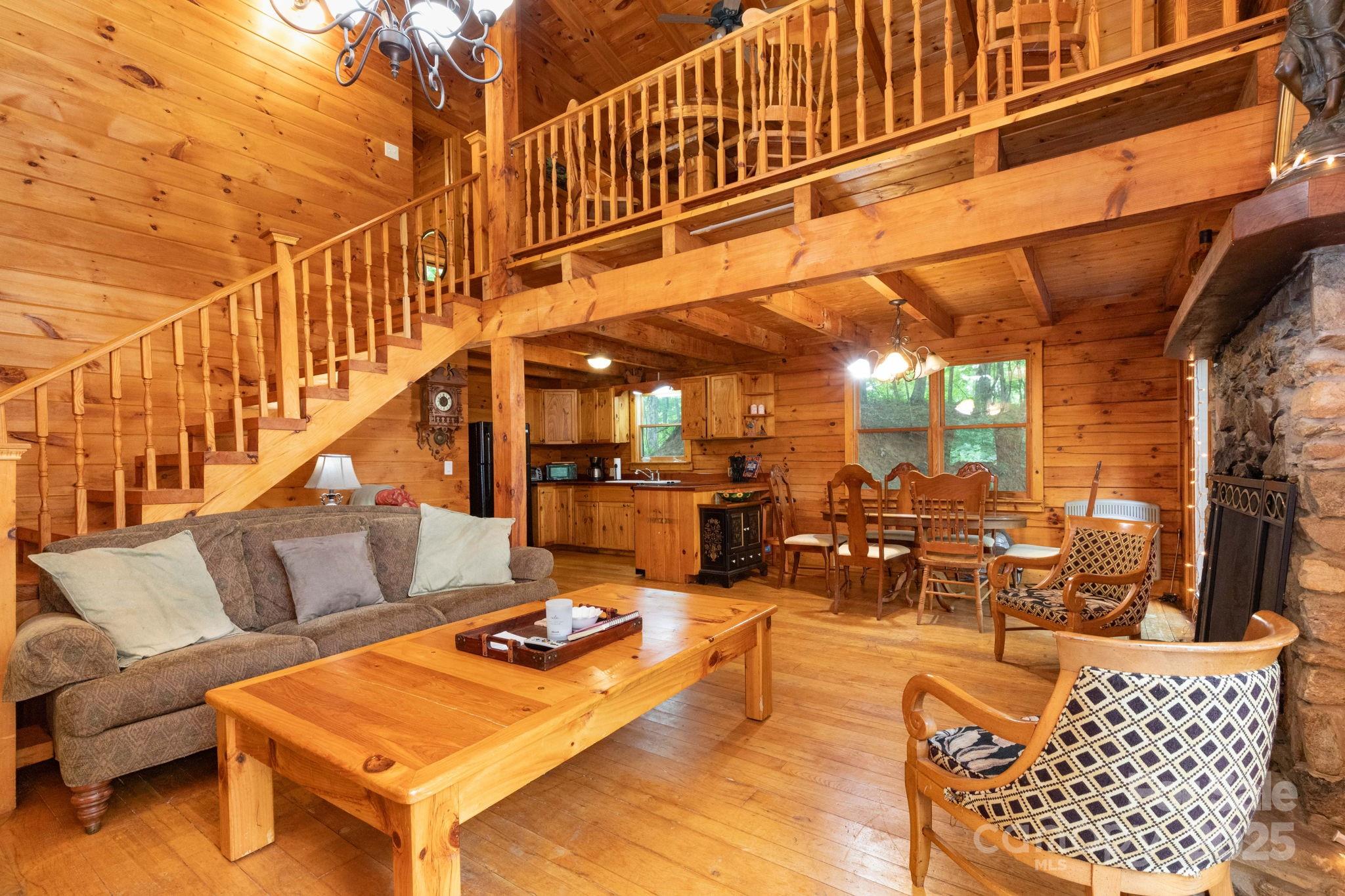 Charming log cabin in a beautiful wooded setting. As you enter, you are drawn in by the soaring cathedral ceiling and the beautiful wood interior! The open floor plan features a living room which is open to kitchen and dining areas which makes an easy flow and is great for entertaining! Beautiful stone fireplace. The home enjoys 2 bedrooms, one on each level and each with adjoining baths that are also accessible from the hall. Enjoy relaxing in the jetted tub in the primary bath. The spacious loft area offers so many possibilities for a second family area, home office, play room or extra hang out space to relax! The covered front porch is the perfect for your rocking chairs! Monitor and electric baseboard heat. There is an open deck for grilling or soaking up the sun. Possibility to purchase some/most of the furniture on a separate bill of sale.