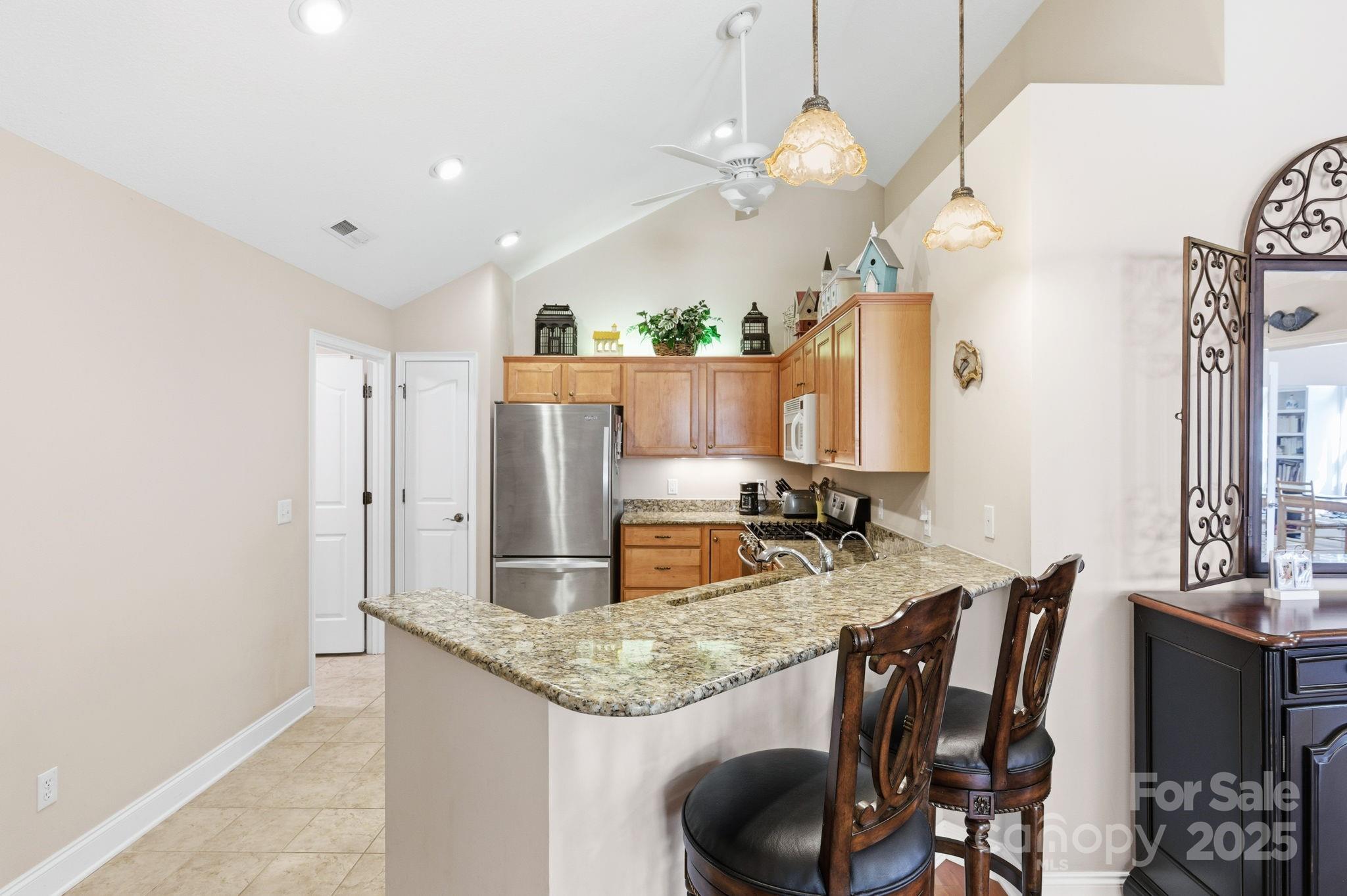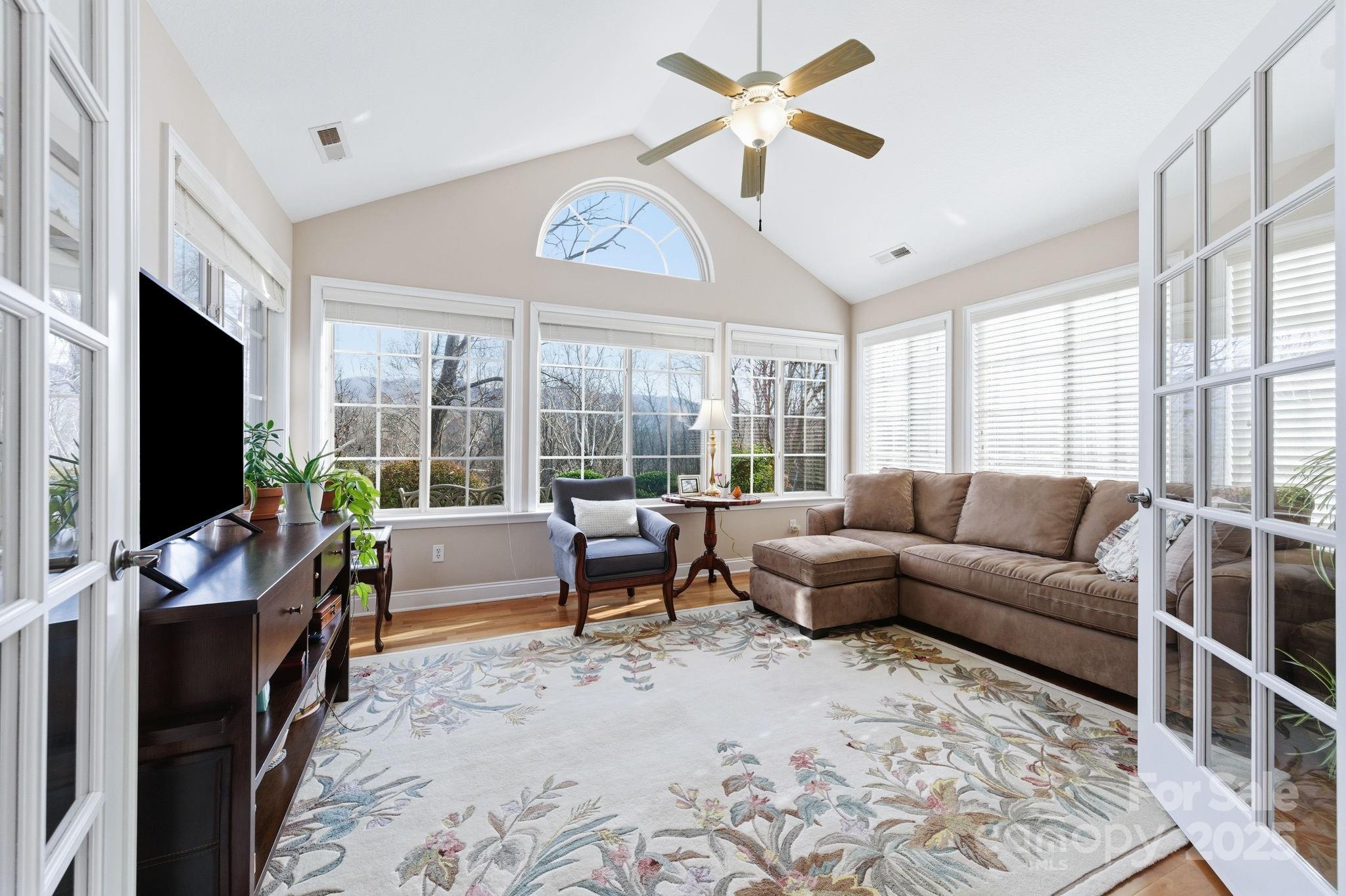 Set in the beautiful Swannanoa Valley, this well-maintained townhome delivers effortless one-level living with stunning natural light and year-round, south-facing views. An open and airy layout connects the living room—with its vaulted ceiling, hardwood floor, and gas fireplace—to a bright sunroom and a dedicated office/den with custom built-ins. The kitchen is designed for both cooking and gathering, offering granite countertops, plenty of cabinet space, a pantry, stainless steel appliances, including a gas stove, a new Bosch dishwasher, microwave and refrigerator, plus instant hot/cold filtered water and a breakfast bar. Arched windows and vaulted ceilings throughout the home frame mountain scenery and fill each room with warmth. Thoughtful details include window treatments, recessed and pendant lighting, and ceiling fans in every room. The spacious primary suite’s bathroom features double vanities, a tile shower with a built-in bench seat, a walk-in closet, and a private water closet. Guest bedroom has long-range views, carpet, and a reach-in closet. Second bathroom has a shower/tub combination and vanity. The laundry room (washer/dryer convey) has plenty of cabinets and closet space and connects to the spacious garage with extra room for storage and gear. This low-maintenance community provides a pool, clubhouse, fitness room, and library, and it’s pet-friendly with direct access to Warren Wilson College’s 35+ miles of trails, farm store offerings, and well-loved community events.