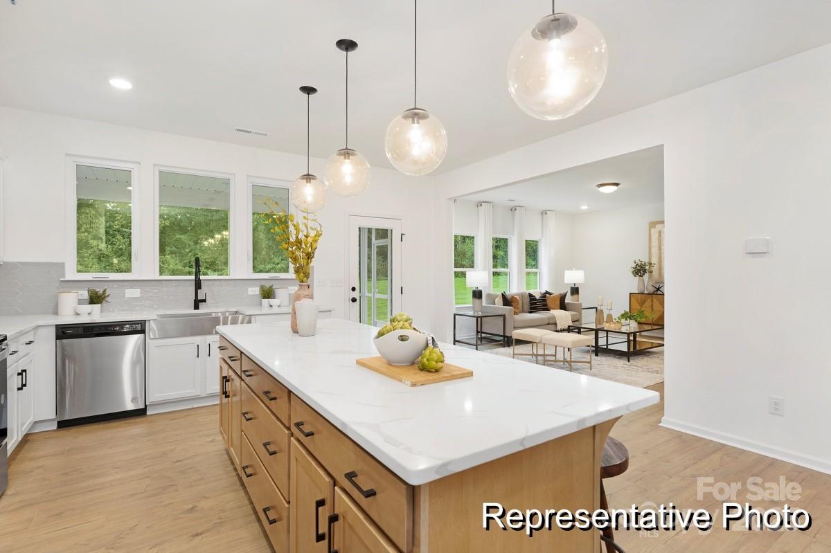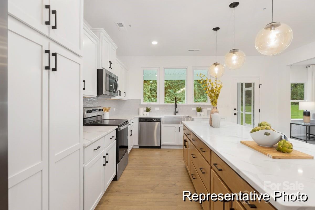 Experience exceptional style in this beautifully appointed 3 BR / 2.5 BA former model home, showcasing an abundance of upgraded fixtures and designer selections. The main floor features hardwoods, a built-in two-person desk with shelves in the private study, shiplap accent wall in the dining area, and designer lighting throughout. The kitchen features an oversized island, a stainless farm sink, soft-close cabinetry, ceramic backsplash, Whirlpool appliances, and a stainless refrigerator. Additional enhancements include dimmable recessed lights, surround-sound speakers, security wiring, contemporary hardware, and neutral accents. Outdoor living shines with a screened porch with ceiling fans, an additional grilling patio, and a wooded, private backyard. The oversized 2-car garage with bump-out adds valuable storage. Contemporary bronze gutters and blinds throughout complete this move-in-ready home. Located in the popular Mount Holly area, Mooreland Oaks features homes with amenities such as trails and multiple common areas. Offering up to $7500 in SPCC.