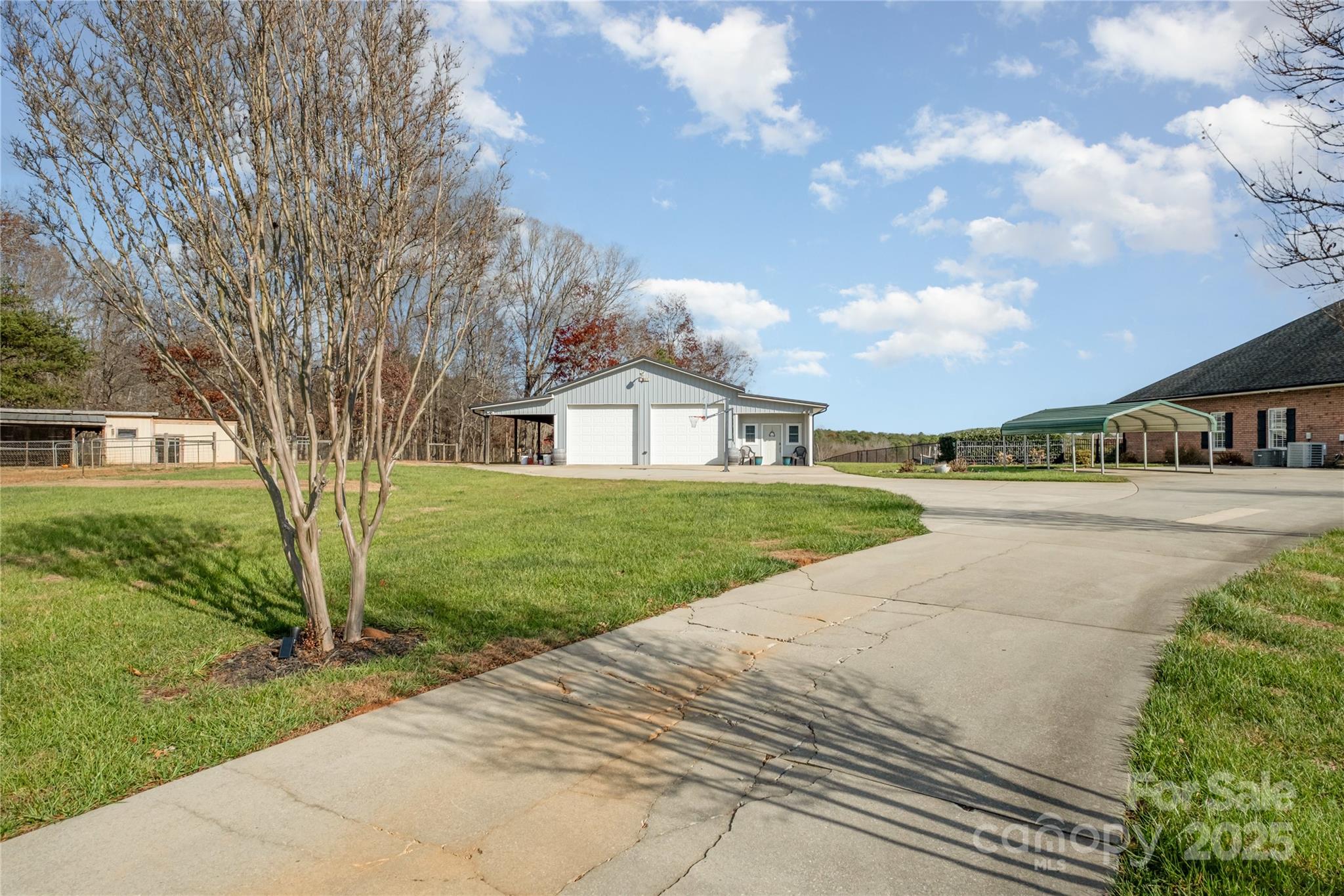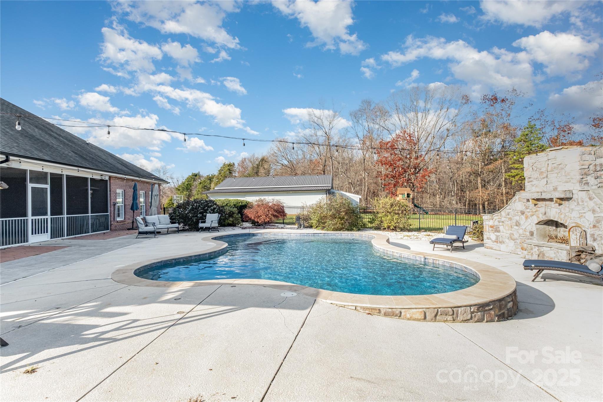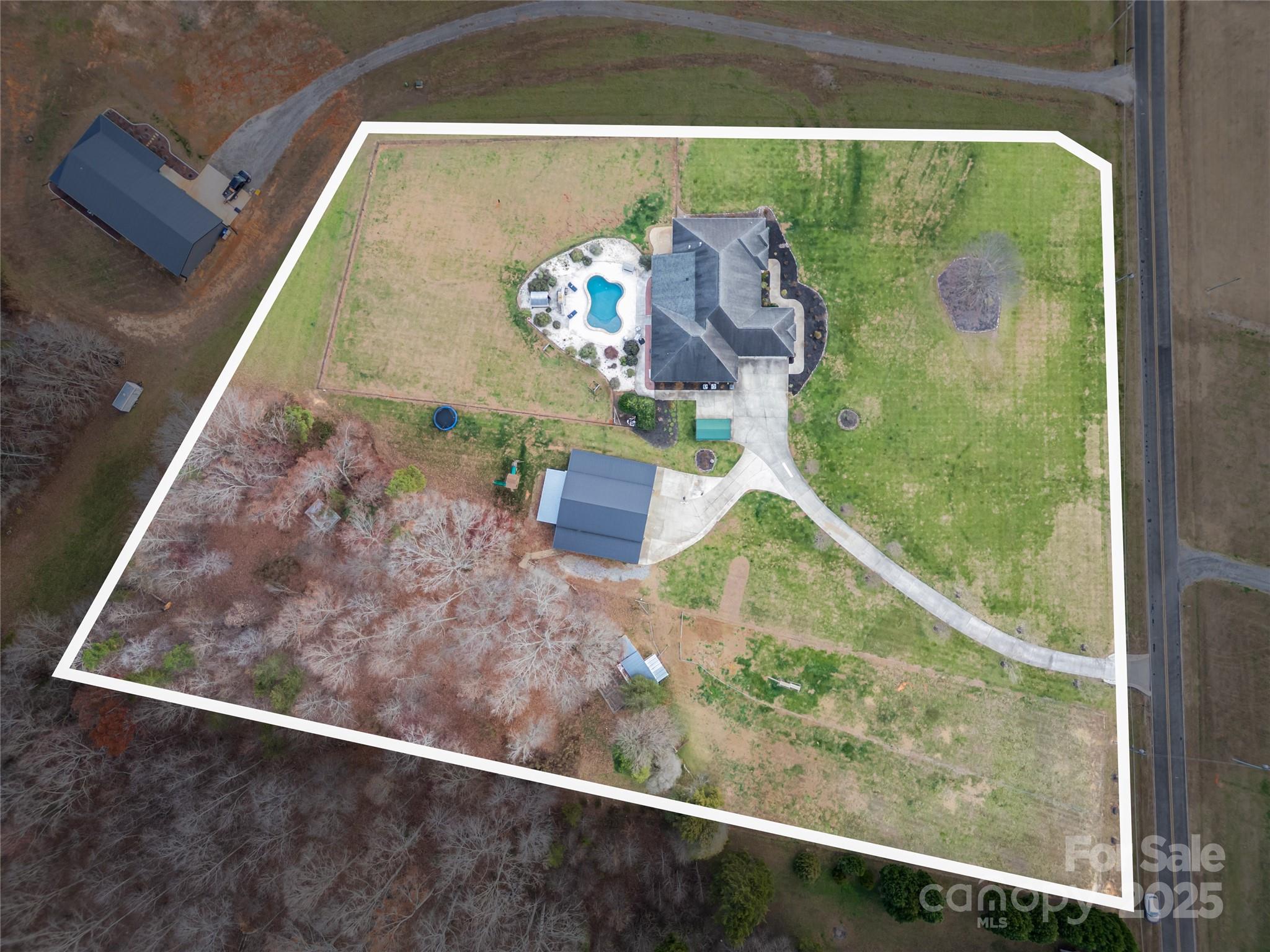 This winding tree lined driveway leads to leads to over 4,000 sq ft of one story living in a full brick home with so much to offer! 5.4 flat acres, Inground pool with sunbathing ledge and outdoor fireplace, fenced yard, screened porch, sunroom, small barn and pasture and a metal building! Metal building features a home office at the back and 1 bedroom apartment that are unpermitted. This exceptional home is built for entertaining with open plan, oversized great room, living room with fireplace, huge kitchen with breakfast area and a formal dining area. Kitchen features a breakfast bar with room for 6 to sit, island, wall ovens, gas cooktop with pot filler, walk in pantry and a breakfast area that overlooks the pool and opens to a sunroom. Great room opens to to a large screened porch. Split bedroom plan with 4 bedrooms. Oversized primary bedroom with fireplace and a sitting area, 2 walk in closets and a primary bath with dual vanities, oversized tub and walk-in tiled shower. Additional en-suite bedroom and 2 additional bedrooms share a bath. 3 car side entry garage. Fenced pasture is currently used as a chicken coop but has held other farm animals. This is a perfect mini farm!