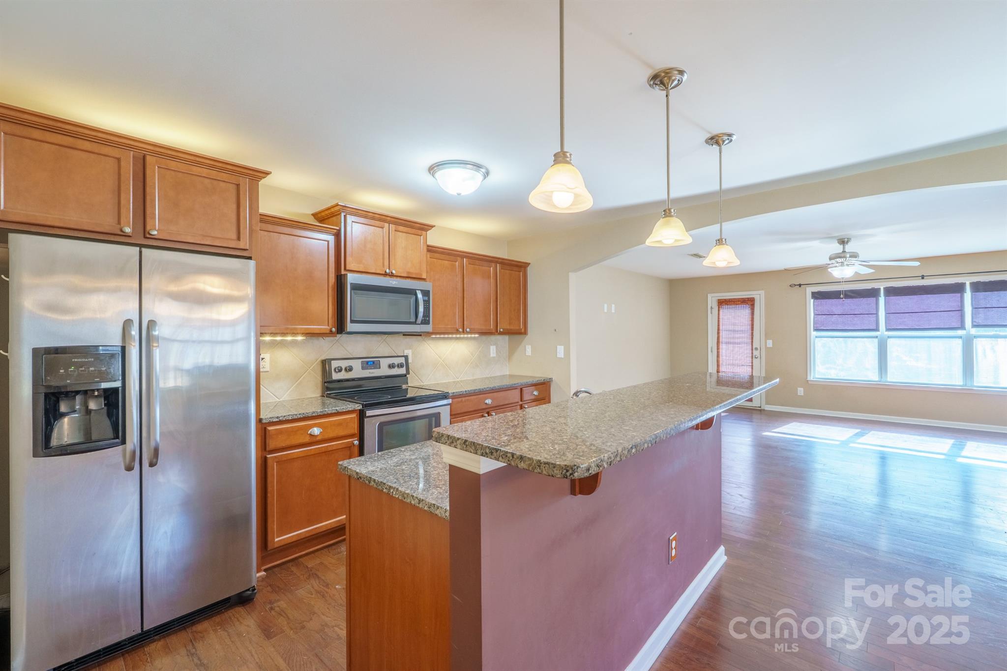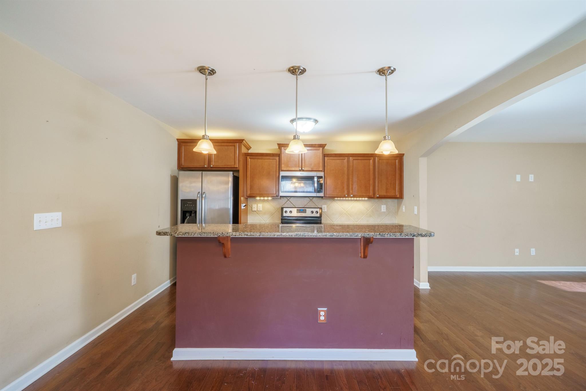 Welcome to this well-kept 2-story home in Pointe St. Andrews, offering 2,000 sq ft of comfortable living with a flowing, open layout. The main level features hardwood-style flooring throughout, a bright living area, and an inviting dining space with upgraded lighting. The kitchen includes ample cabinet storage, stainless appliances, a center island, breakfast bar, and large windows in common overlooking the backyard—perfect for natural lightp. A convenient main-level laundry room and a half bath sit just off the foyer and garage entry. Upstairs, the spacious primary suite includes a walk-in closet and a bath with dual sinks. Two additional bedrooms, a full hall bath, and a a flex room with a closet- perfect for a nursery, office or small guest space. Enjoy a fenced backyard with plenty of usable space—ideal for outdoor living, pets, or future garden plans. The covered front porch, attached spacious 2-car garage, and wide driveway add everyday convenience. Located in a sidewalk-lined community with streetlights and quick access to Concord amenities.