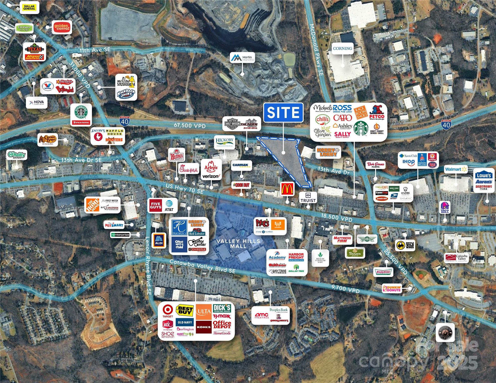 Premier +/- 11-acre development opportunity at 2151 21st Street Ln SE in Hickory, NC, ideally positioned in Catawba County’s thriving retail corridor. Zoned C-3, this parcel offers exceptional visibility from I-40 and sits just off heavily traveled Hwy 70, ensuring strong traffic counts and exposure. The site is surrounded by major national retailers and established commercial destinations, located directly across from Valley Hills Mall and adjacent to the Hickory Metro Convention Center. With its placement in a highly developed, high-demand trade area, this property presents a prime opportunity for a wide range of commercial, hospitality, or mixed-use development.