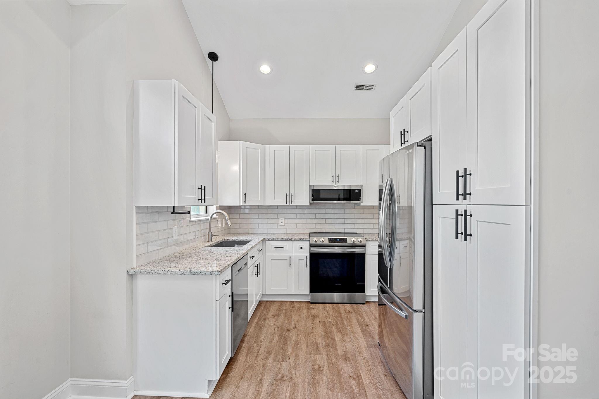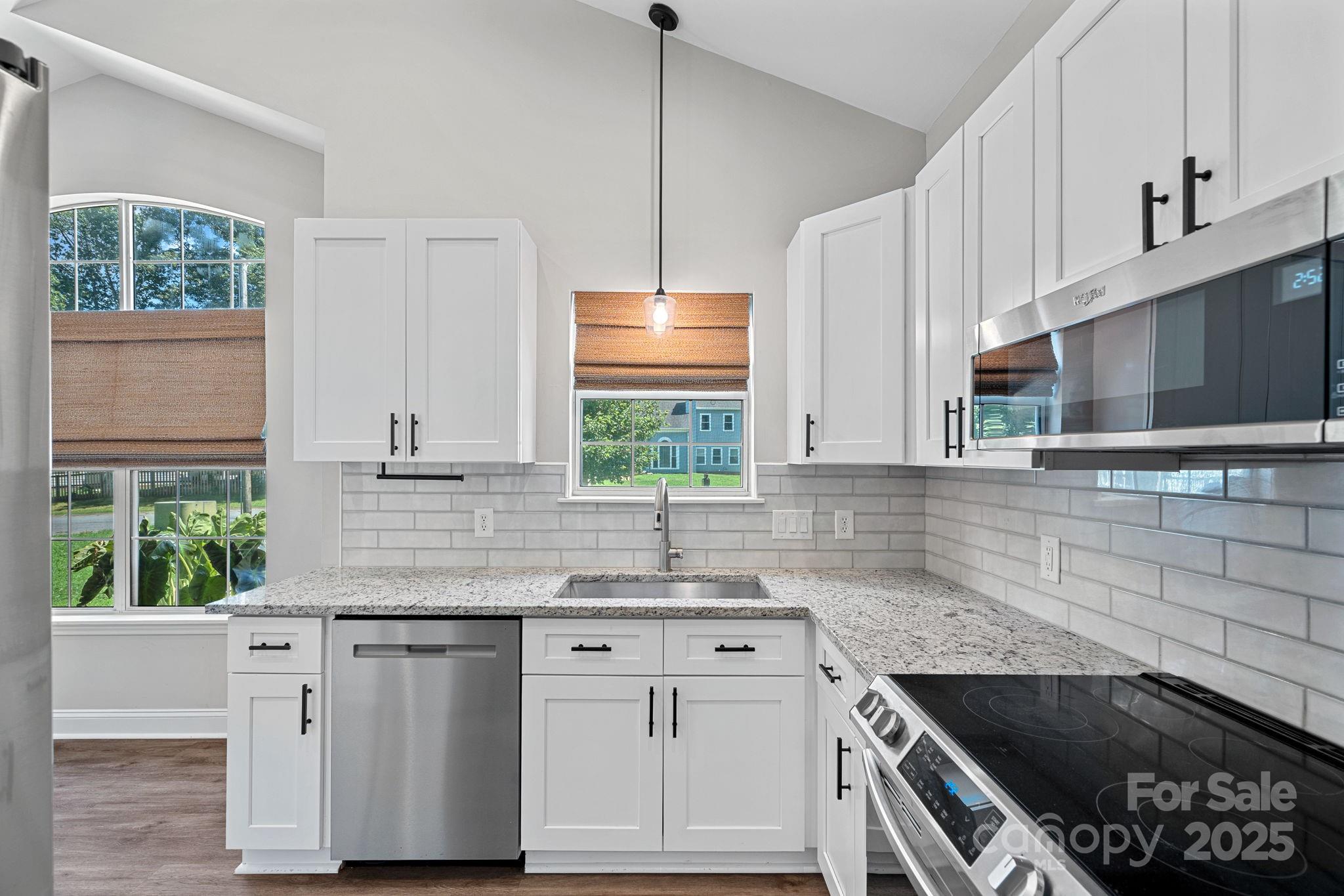 Welcome home to a charming and ready to move in ranch home located within walk/bike to historic Cornelius. NO HOA! Top rated schools, 3 bedrooms and 2 full baths. This is the small-town low-maintenance life you have been searching for! Cornelius offers everything you need within a short distance. Lg living area with flex space for office/dining,plantaions shutters throughout, French door. All the expensive updates have been recently made including a master suite with vaulted ceilings, a custom wood shelving large walk-in closet, and a walk-in shower. More upgrades include, replacement of kitchen cabinets (2024), new vanities in both bathrooms. HVAC and roof replaced in 2017 and all major stainless-steel appliances recently replaced including, glass-surface stove, microwave, dishwasher, and refrigerator. W/D are also included. The den is open to the formal DR/flex room. Enjoy your backyard with the beautiful privacy fence built 2025. Exterior painted in 2021, interior painted 2025.