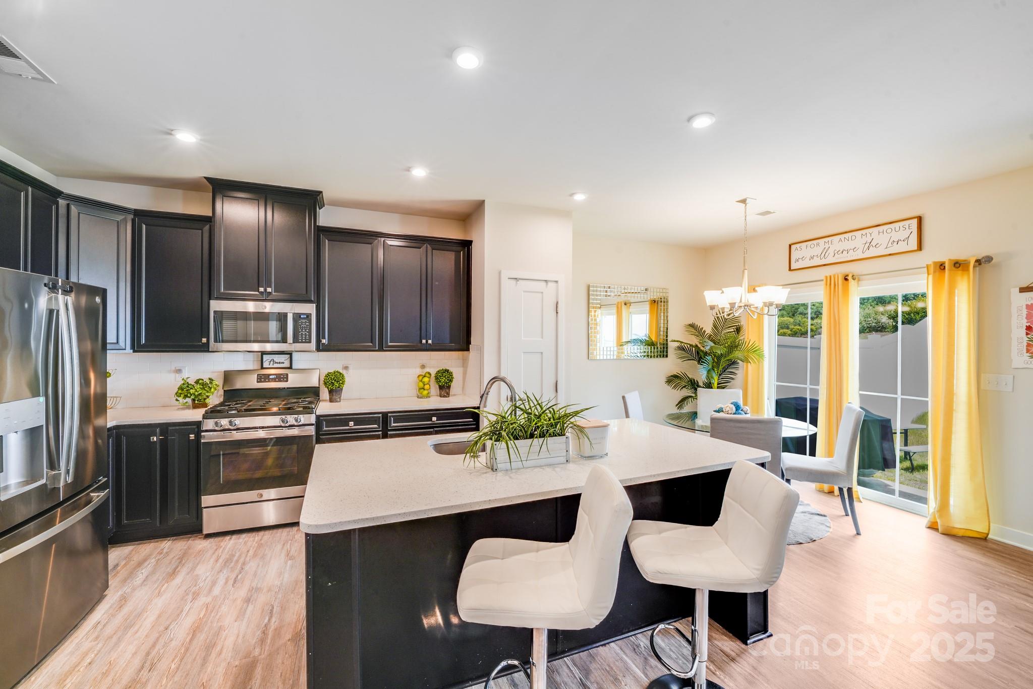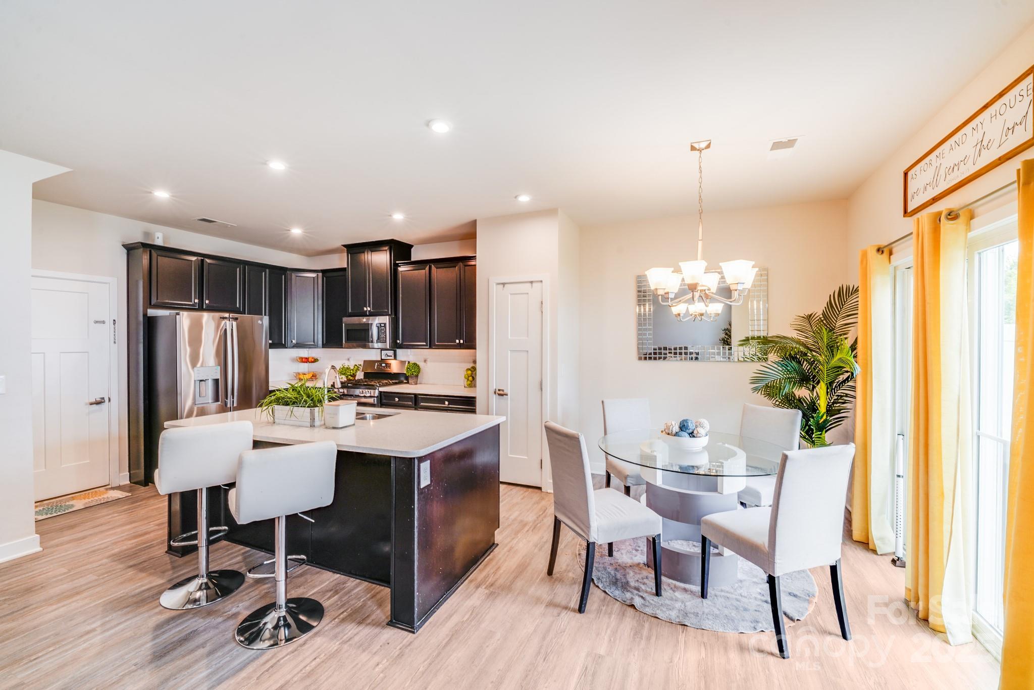 Beautiful, newer townhome built in 2022 in a fantastic location w/award winning schools in Cabarrus County. Lovely kitchen w/upgraded recessed lighting, shaker style cabinetry, gorgeous quartz countertops, large island, gas stove, subway tile backsplash, stainless steel appliances w/the REFRIGERATOR INCLUDED! Sellers selected to include a separate pantry in addition to the utility closet. Luxury vinyl plank throughout the entire downstairs. Upgraded fireplace w/white marble. Primary bedroom upstairs has split walk in closets. Primary bath comes with large, upgraded tiled shower w/dual shower heads. Two additional good size bedrooms upstairs share the secondary bathroom w/tiled tub/shower combo. HIGH END GE WASHER AND DRYER INCLUDED in the conveniently located laundry room upstairs which also includes a handy closet. Multiple ceiling fans throughout. The backyard has a patio and is enclosed with a privacy fence. Attached two car garage. Most of the home has been freshly painted.