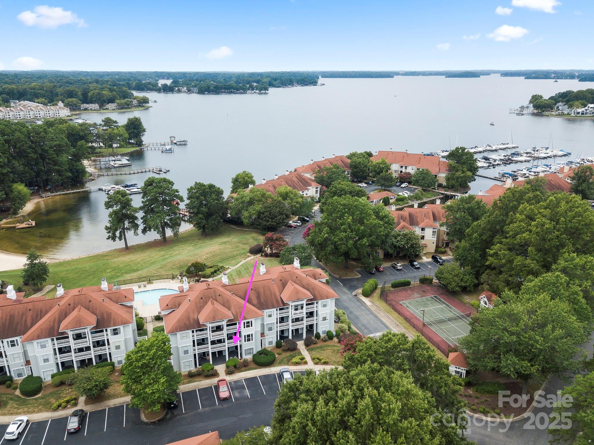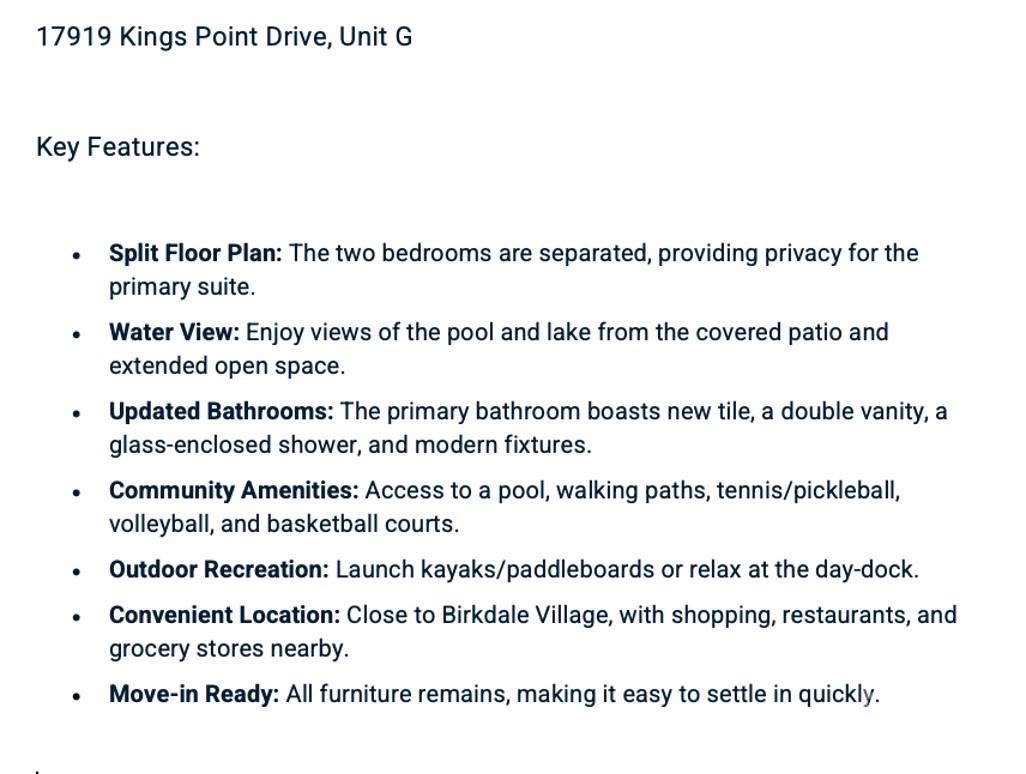 Step into this beautifully updated ground-floor, 2-bedroom, 2-bathroom condo featuring a desirable split floor plan, modern finishes, with lake and pool views. The primary suite offers direct patio access and a newly renovated spa-like bathroom with a double vanity, glass-enclosed shower, and stylish tile upgrades. The open living space leads to a covered patio perfect for relaxing while overlooking the sparkling pool and serene lake. Freshly painted and move-in ready, the condo boasts hardwood floors, tile, and carpet throughout. Resort-style amenities include a swimming pool, walking paths, tennis and pickleball courts, volleyball, basketball, pier and day-dock for kayaking or paddleboarding. Safe Harbor Marina at Kings Point is just minutes away for convenient boat storage. This condo offers the perfect blend of relaxation and accessibility. All furniture is included— it invites you to simply arrive, unwind, and embrace the lakefront lifestyle!