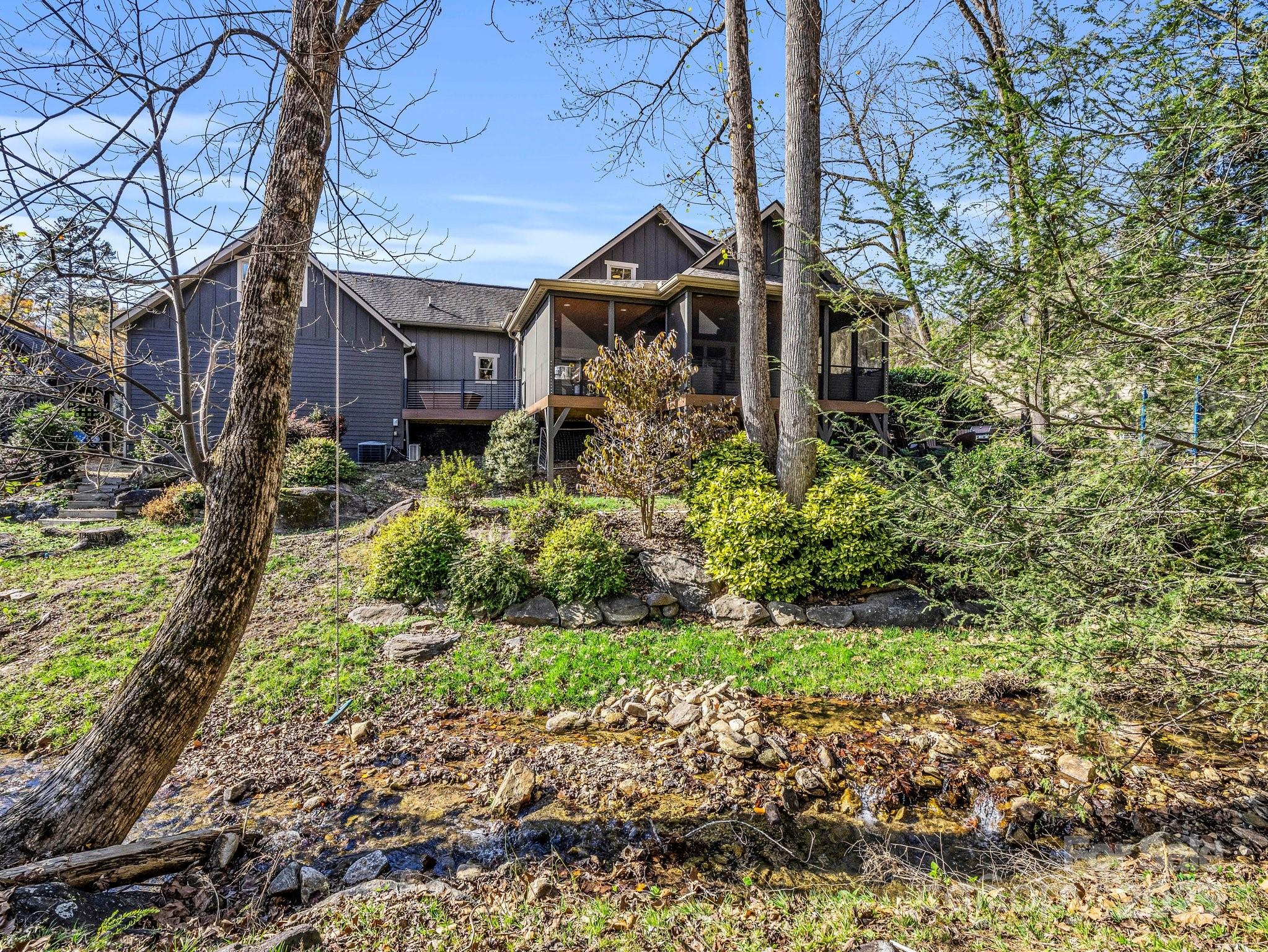 Rare opportunity-Beautifully designed Arts & Crafts home offering main level living in the gated community of Firefly Cove. 3 Bedrooms & 2.5 Bathrooms ft. open floor plan, Brazilian cherry wood floors, wood-burning stove & an abundance of natural light. The chef's kitchen features a massive granite island w/ breakfast bar, a gas cooktop with a custom copper hood, & double ovens. Spacious primary suite w/ tiled shower, garden tub, and dual vanity. Step outside to the expansive 447sqft screened back deck, accessible from both the dining room and primary bedroom where you can enjoy serene sounds and views of the creek. The meticulously landscaped yard also features a stone patio & there is even a hot/cold water "plunge tub". Upstairs, two generously sized guest bedrooms & full bathroom w/ dual vanity. Two-car garage & F.R.O.G that can serve as a playroom, office, or additional living space. Community amenities-stunning clubhouse, gym, outdoor heated saltwater pool & lake access!